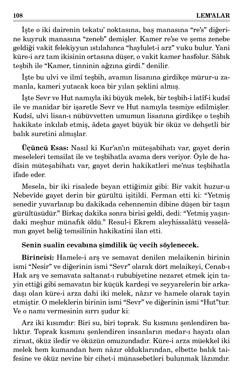 İşte Sevr ve Hut namıyla iki büyük melek, bir teşbih-i latîf-i kudsî ile ve manidar bir işaretle Sevr ve Hut namıyla tesmiye edilmişler. Kudsî, ulvi lisan-ı nübüvvetten umumun lisanına girdikçe o teşbih hakikate inkılab etmiş, âdeta gayet büyük bir öküz ve dehşetli bir balık suretini almışlar.
