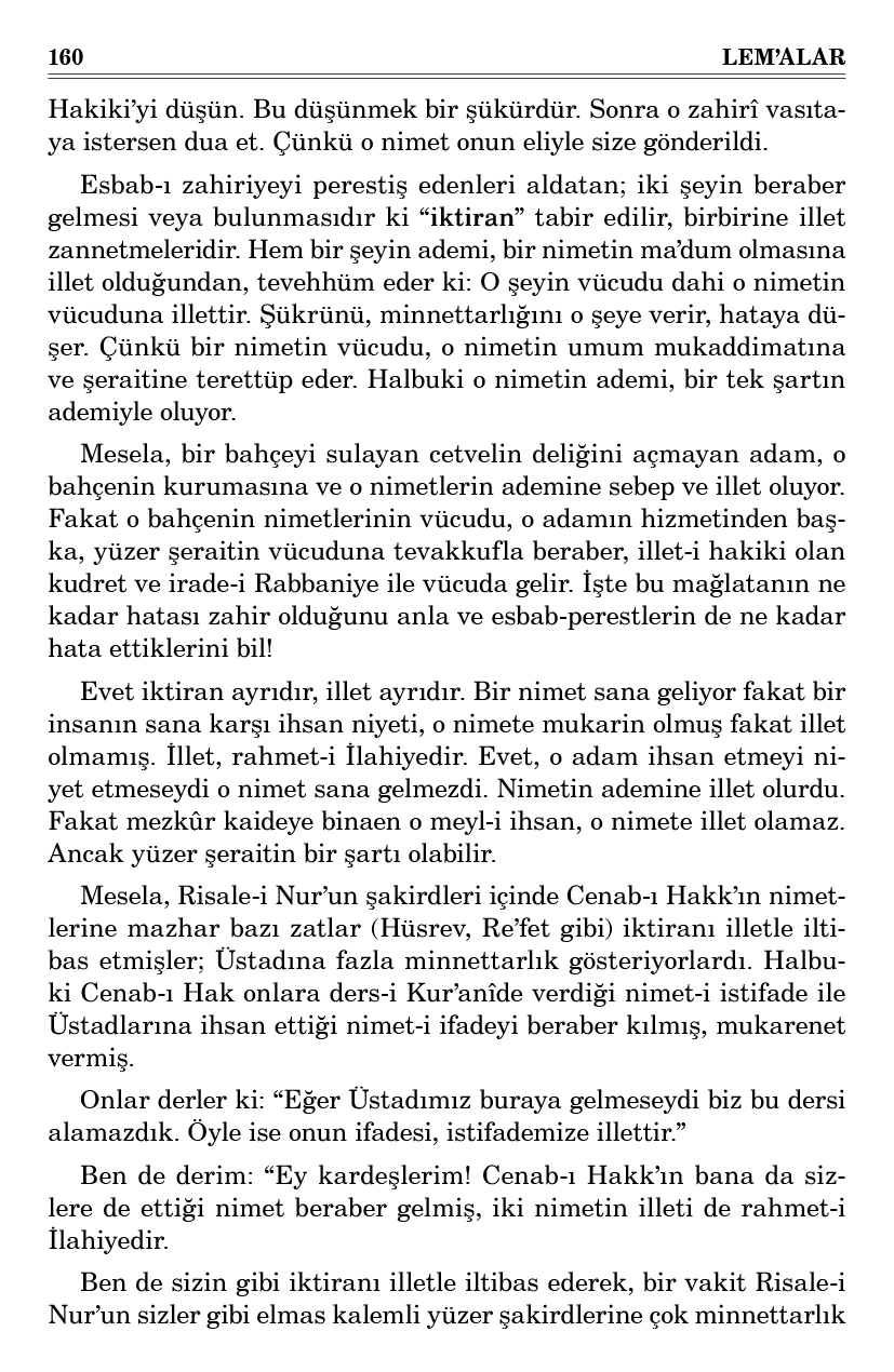 Esbab-ı zahiriyeyi perestiş edenleri aldatan; iki şeyin beraber gelmesi veya bulunmasıdır ki “iktiran” tabir edilir, birbirine illet zannetmeleridir. Hem bir şeyin ademi, bir nimetin ma’dum olmasına illet olduğundan, tevehhüm eder ki: O şeyin vücudu dahi o nimetin vücuduna illettir. Şükrünü, minnettarlığını o şeye verir, hataya düşer. Çünkü bir nimetin vücudu, o nimetin umum mukaddimatına ve şeraitine terettüp eder. Halbuki o nimetin ademi, bir tek şartın ademiyle oluyor.