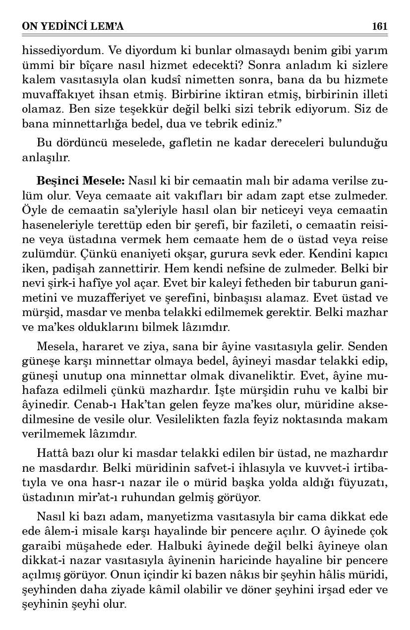 Mesela, Risale-i Nur’un şakirdleri içinde Cenab-ı Hakk’ın nimetlerine mazhar bazı zatlar (Hüsrev, Re’fet gibi) iktiranı illetle iltibas etmişler; Üstadına fazla minnettarlık gösteriyorlardı. Halbuki Cenab-ı Hak onlara ders-i Kur’anîde verdiği nimet-i istifade ile Üstadlarına ihsan ettiği nimet-i ifadeyi beraber kılmış, mukarenet vermiş.