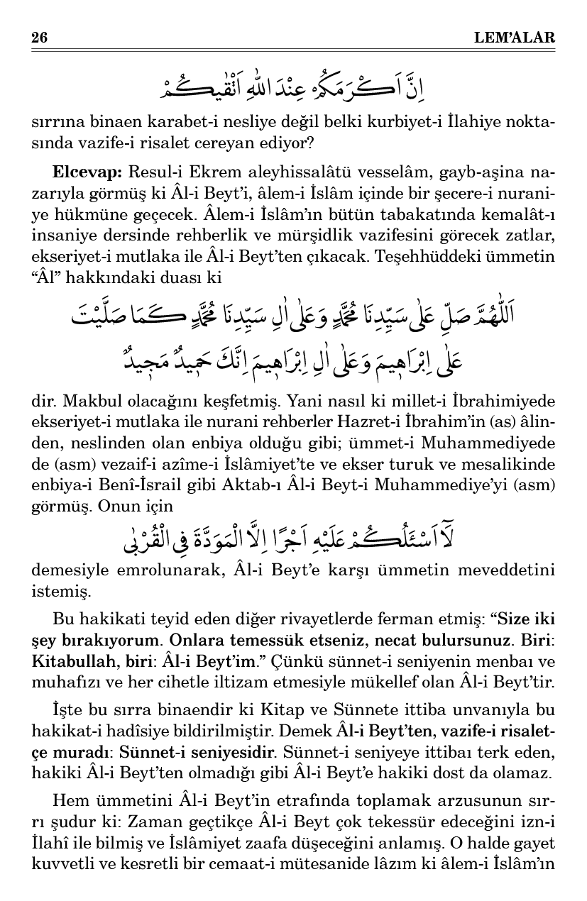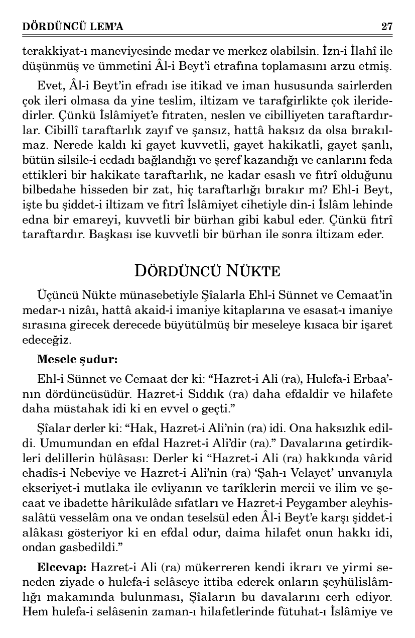 Evet, Âl-i Beyt’in efradı ise itikad ve iman hususunda sairlerden çok ileri olmasa da yine teslim, iltizam ve tarafgirlikte çok ileridedirler. Çünkü İslâmiyet’e fıtraten, neslen ve cibilliyeten taraftardırlar. Cibillî taraftarlık zayıf ve şansız, hattâ haksız da olsa bırakılmaz. Nerede kaldı ki gayet kuvvetli, gayet hakikatli, gayet şanlı, bütün silsile-i ecdadı bağlandığı ve şeref kazandığı ve canlarını feda ettikleri bir hakikate taraftarlık, ne kadar esaslı ve fıtrî olduğunu bilbedahe hisseden bir zat, hiç taraftarlığı bırakır mı? Ehl-i Beyt, işte bu şiddet-i iltizam ve fıtrî İslâmiyet cihetiyle din-i İslâm lehinde edna bir emareyi, kuvvetli bir bürhan gibi kabul eder. Çünkü fıtrî taraftardır. Başkası ise kuvvetli bir bürhan ile sonra iltizam eder.