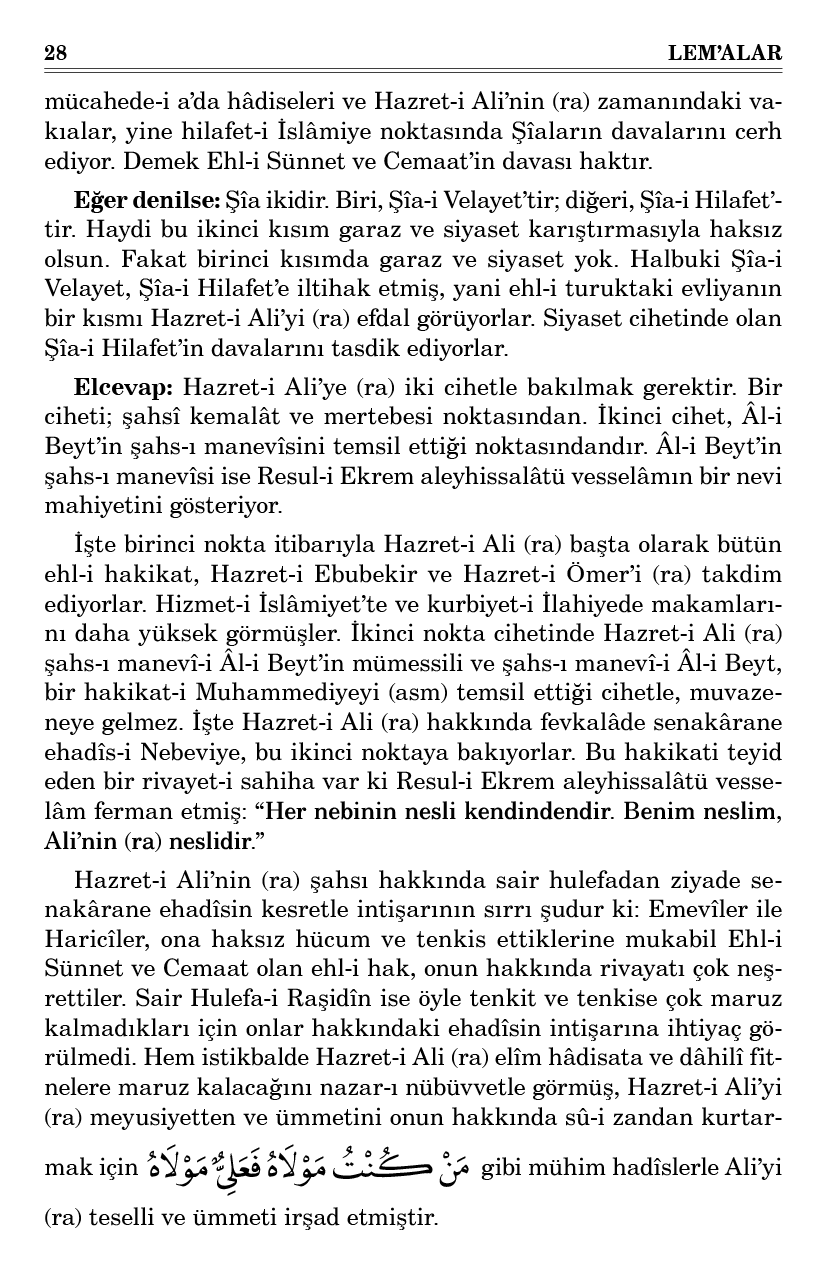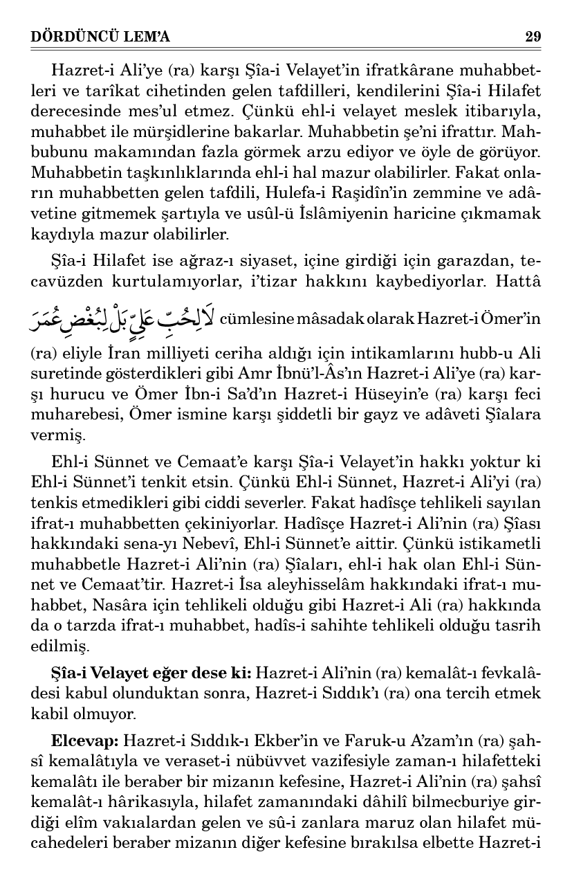 Ehl-i Sünnet ve Cemaat’e karşı Şîa-i Velayet’in hakkı yoktur ki Ehl-i Sünnet’i tenkit etsin. Çünkü Ehl-i Sünnet, Hazret-i Ali’yi (ra) tenkis etmedikleri gibi ciddi severler. Fakat hadîsçe tehlikeli sayılan ifrat-ı muhabbetten çekiniyorlar. Hadîsçe Hazret-i Ali’nin (ra) Şîası hakkındaki sena-yı Nebevî, Ehl-i Sünnet’e aittir. Çünkü istikametli muhabbetle Hazret-i Ali’nin (ra) Şîaları, ehl-i hak olan Ehl-i Sünnet ve Cemaat’tir. Hazret-i İsa aleyhisselâm hakkındaki ifrat-ı muhabbet, Nasâra için tehlikeli olduğu gibi Hazret-i Ali (ra) hakkında da o tarzda ifrat-ı muhabbet, hadîs-i sahihte tehlikeli olduğu tasrih edilmiş.