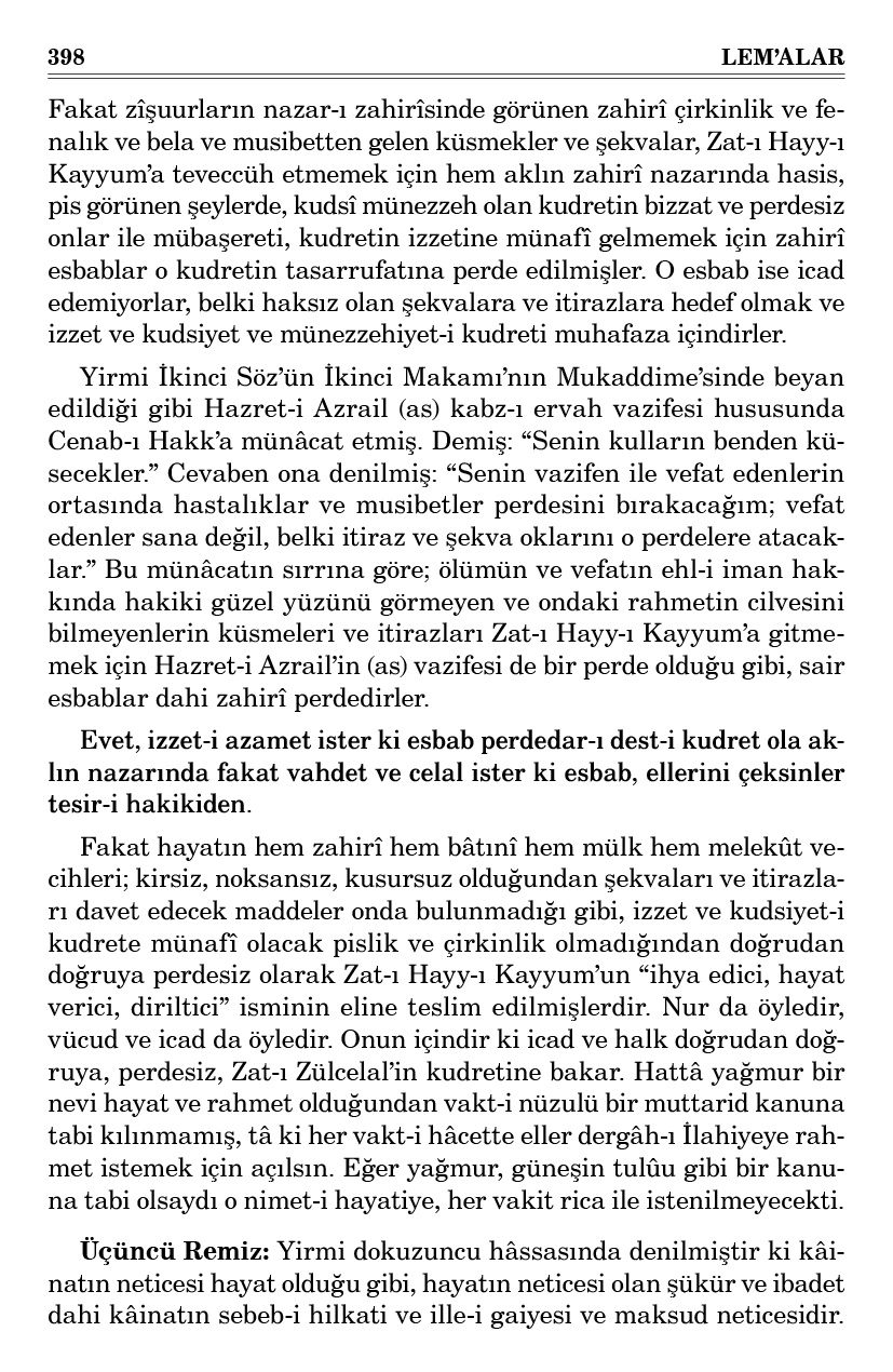 İşte bu sırr-ı rububiyete göre teşekkür ve ubudiyet, bütün enva-ı hayatın ve dolayısıyla bütün kâinatın en ehemmiyetli gayesi olduğundandır ki Kur’an-ı Mu’cizü’l-Beyan, pek çok hararetle ve şiddetle ve halâvetle şükür ve ibadete sevk ediyor. Ve ibadet Cenab-ı Hakk’a mahsus ve şükür ona lâyık ve hamd ona hastır, diye çok tekrar ile beyan ediyor. Demek bu şükür ve ibadet, doğrudan doğruya Mâlik-i Hakiki’sine gitmek lâzım olduğunu ifade için hayatı bütün şuunatıyla perdesiz kabza-i tasarrufunda tutmasına delâlet eden