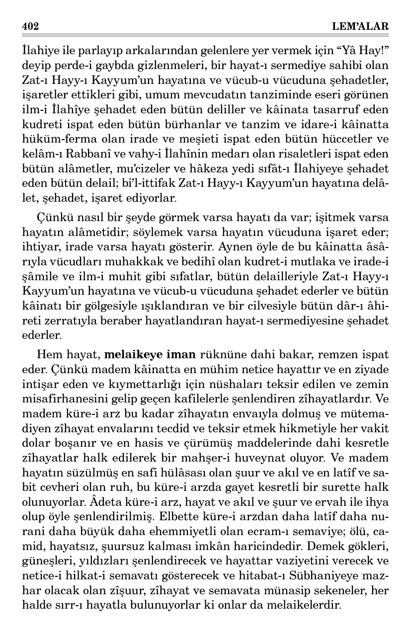 Hem hayat, iman-ı bi’l-kader rüknüne bakıyor, remzen ispat eder. Çünkü madem hayat, âlem-i şehadetin ziyasıdır ve istila ediyor ve vücudun neticesi ve gayesidir ve Hâlık-ı kâinat’ın en câmi’ âyinesidir ve faaliyet-i Rabbaniyenin en mükemmel enmuzeci ve fihristesidir, temsilde hata olmasın, bir nevi programı hükmündedir. Elbette âlem-i gayb yani mazi, müstakbel yani geçmiş ve gelecek mahlukatın