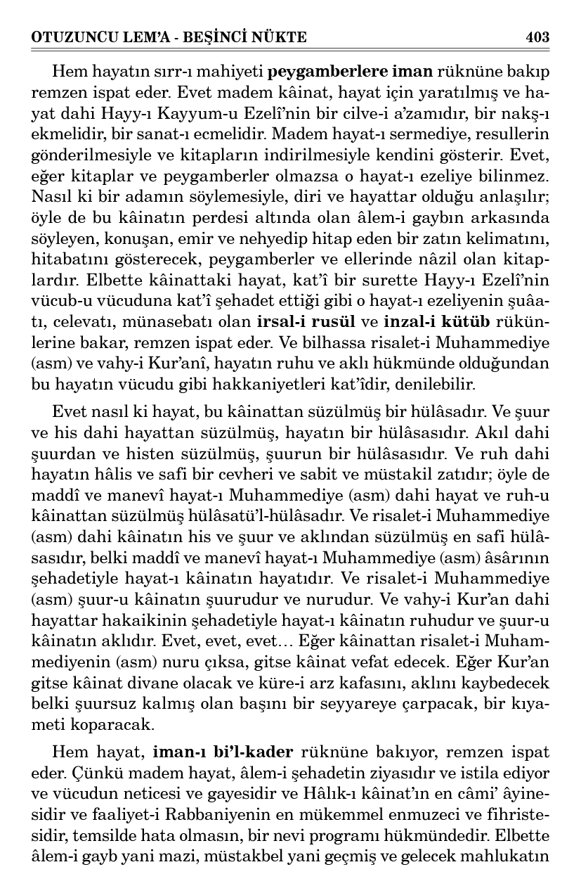 Evet nasıl ki hayat, bu kâinattan süzülmüş bir hülâsadır. Ve şuur ve his dahi hayattan süzülmüş, hayatın bir hülâsasıdır. Akıl dahi şuurdan ve histen süzülmüş, şuurun bir hülâsasıdır. Ve ruh dahi hayatın hâlis ve safi bir cevheri ve sabit ve müstakil zatıdır; öyle de maddî ve manevî hayat-ı Muhammediye (asm) dahi hayat ve ruh-u kâinattan süzülmüş hülâsatü’l-hülâsadır. Ve risalet-i Muhammediye (asm) dahi kâinatın his ve şuur ve aklından süzülmüş en safi hülâsasıdır, belki maddî ve manevî hayat-ı Muhammediye (asm) âsârının şehadetiyle hayat-ı kâinatın hayatıdır. Ve risalet-i Muhammediye (asm) şuur-u kâinatın şuurudur ve nurudur. Ve vahy-i Kur’an dahi hayattar hakaikinin şehadetiyle hayat-ı kâinatın ruhudur ve şuur-u kâinatın aklıdır. Evet, evet, evet… Eğer kâinattan risalet-i Muhammediyenin (asm) nuru çıksa, gitse kâinat vefat edecek. Eğer Kur’an gitse kâinat divane olacak ve küre-i arz kafasını, aklını kaybedecek belki şuursuz kalmış olan başını bir seyyareye çarpacak, bir kıyameti koparacak.