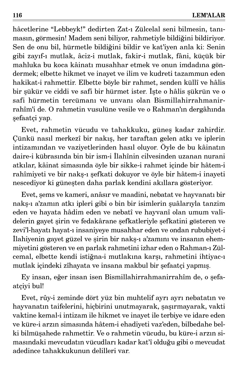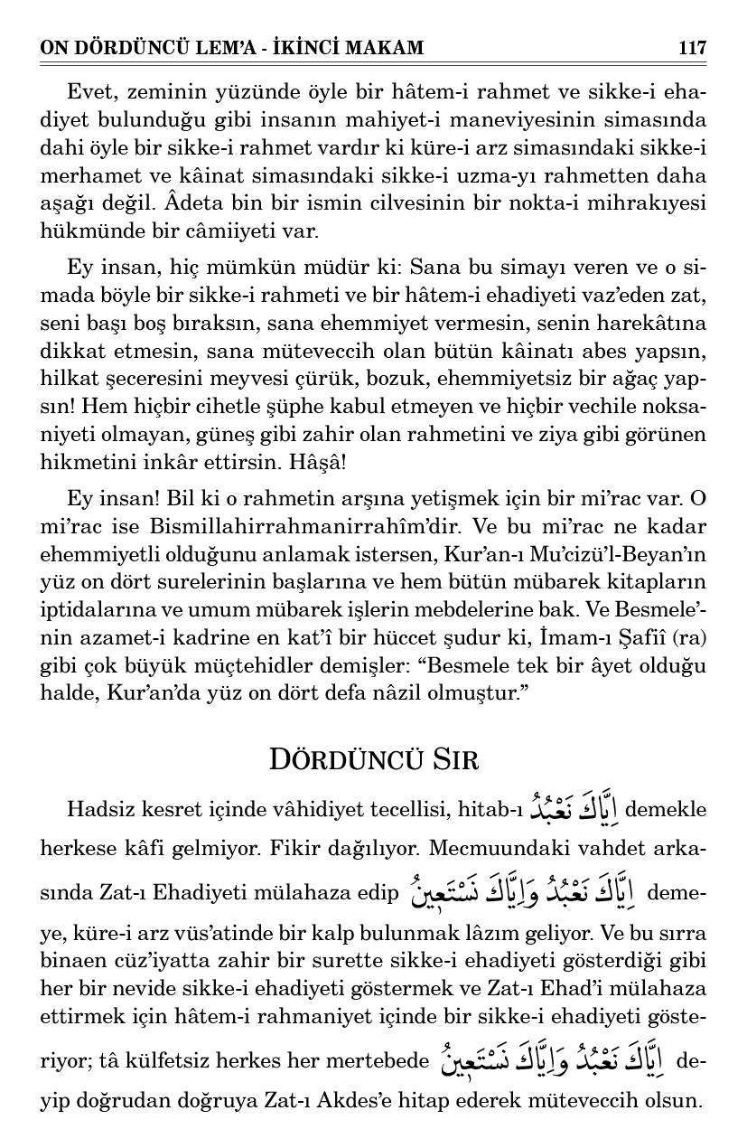Ey insan! Bil ki o rahmetin arşına yetişmek için bir mi’rac var. O mi’rac ise Bismillahirrahmanirrahîm’dir. Ve bu mi’rac ne kadar ehemmiyetli olduğunu anlamak istersen, Kur’an-ı Mu’cizü’l-Beyan’ın yüz on dört surelerinin başlarına ve hem bütün mübarek kitapların iptidalarına ve umum mübarek işlerin mebdelerine bak. Ve Besmele’nin azamet-i kadrine en kat’î bir hüccet şudur ki, İmam-ı Şafiî (ra) gibi çok büyük müçtehidler demişler: “Besmele tek bir âyet olduğu halde, Kur’an’da yüz on dört defa nâzil olmuştur.”