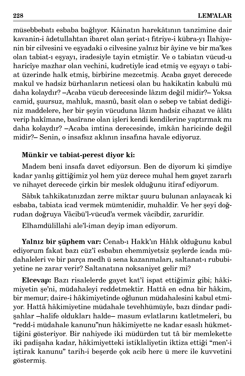 Madem beni insafa davet ediyorsun. Ben de diyorum ki şimdiye kadar yanlış gittiğimiz yol hem yüz derece muhal hem gayet zararlı ve nihayet derecede çirkin bir meslek olduğunu itiraf ediyorum. Sâbık tahkikatınızdan zerre miktar şuuru bulunan anlayacak ki esbaba, tabiata icad vermek mümtenidir, muhaldir. Ve her şeyi doğrudan doğruya Vâcibü’l-vücud’a vermek vâcibdir, zarurîdir. Elhamdülillahi ale’l-iman deyip iman ediyorum.
