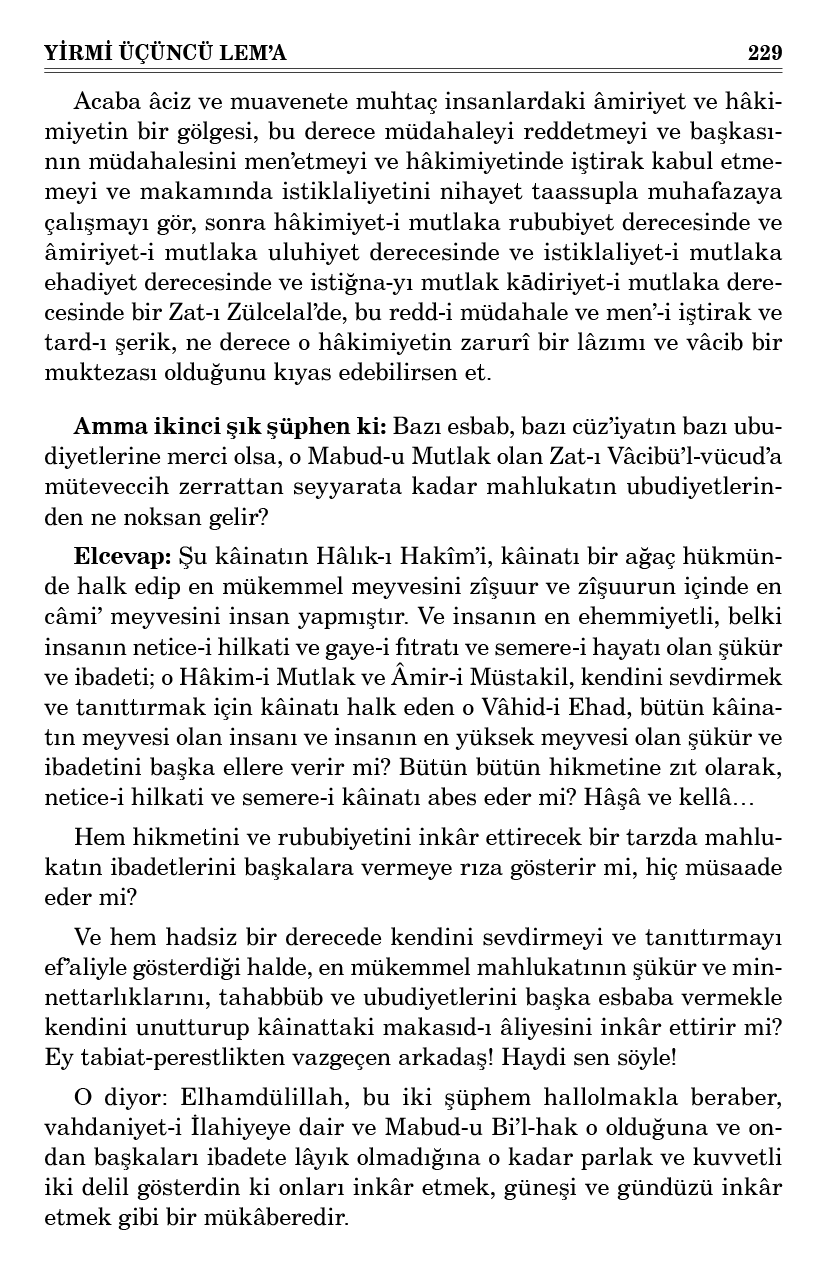 Yalnız bir şüphem var: Cenab-ı Hakk’ın Hâlık olduğunu kabul ediyorum fakat bazı cüz’î esbabın ehemmiyetsiz şeylerde icada müdahaleleri ve bir parça medh ü sena kazanmaları, saltanat-ı rububiyetine ne zarar verir? Saltanatına noksaniyet gelir mi?