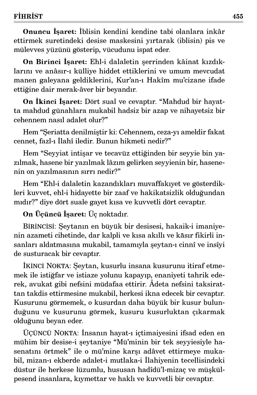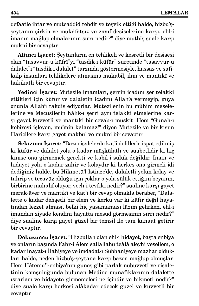 Dokuzuncu İşaret: “Hizbullah olan ehl-i hidayet, başta enbiya ve onların başında Fahr-i Âlem sallallahu teâlâ aleyhi vesellem, o kadar inayat-ı İlahiyeye ve imdadat-ı Sübhaniyeye mazhar oldukları halde, neden hizbü’ş-şeytana karşı bazen mağlup olmuşlar. Hem Hâtemü’l-enbiya’nın güneş gibi parlak nübüvveti ve risaletinin komşuluğunda bulunan Medine münafıklarının dalalette ısrarları ve hidayete girmemeleri ne içindir ve hikmeti nedir?” diye suale karşı herkesi alâkadar edecek güzel ve kuvvetli bir cevaptır.