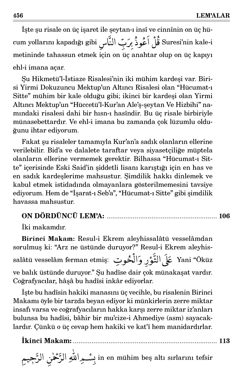 İşte şu risale on üç işaret ile şeytan-ı insî ve cinnînin on üç hücum yollarını kapadığı gibi قُلْ اَعُوذُ بِرَبِّ النَّاسِ Suresi’nin kale-i metininde tahassun etmek için on üç anahtar olup on üç kapıyı ehl-i imana açar.