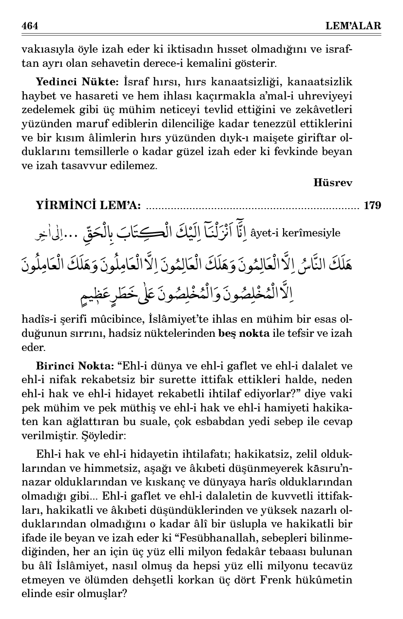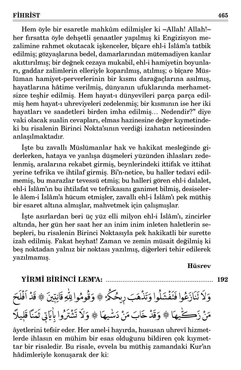 Ehl-i hak ve ehl-i hidayetin ihtilafatı; hakikatsiz, zelil olduklarından ve himmetsiz, aşağı ve âkıbeti düşünmeyerek kāsıru’n-nazar olduklarından ve kıskanç ve dünyaya harîs olduklarından olmadığı gibi... Ehl-i gaflet ve ehl-i dalaletin de kuvvetli ittifakları, hakikatli ve âkıbeti düşündüklerinden ve yüksek nazarlı olduklarından olmadığını o kadar âlî bir üslupla ve hakikatli bir ifade ile beyan ve izah eder ki “Fesübhanallah, sebepleri bilinmediğinden, her an için üç yüz elli milyon fedakâr tebaası bulunan bu âlî İslâmiyet, nasıl olmuş da hepsi yüz elli milyonu tecavüz etmeyen ve ölümden dehşetli korkan üç dört Frenk hükûmetin elinde esir olmuşlar?