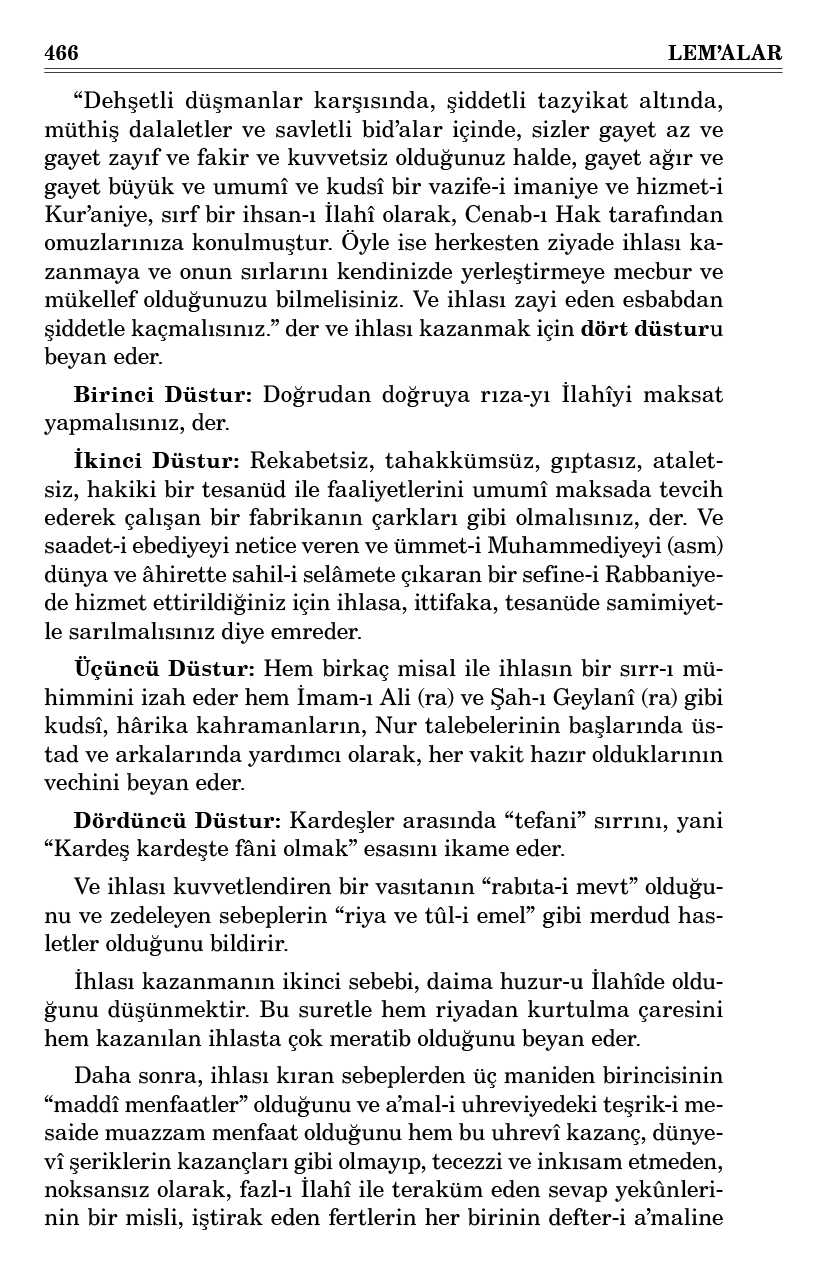 “Dehşetli düşmanlar karşısında, şiddetli tazyikat altında, müthiş dalaletler ve savletli bid’alar içinde, sizler gayet az ve gayet zayıf ve fakir ve kuvvetsiz olduğunuz halde, gayet ağır ve gayet büyük ve umumî ve kudsî bir vazife-i imaniye ve hizmet-i Kur’aniye, sırf bir ihsan-ı İlahî olarak, Cenab-ı Hak tarafından omuzlarınıza konulmuştur. Öyle ise herkesten ziyade ihlası kazanmaya ve onun sırlarını kendinizde yerleştirmeye mecbur ve mükellef olduğunuzu bilmelisiniz. Ve ihlası zayi eden esbabdan şiddetle kaçmalısınız.” der ve ihlası kazanmak için dört düsturu beyan eder.