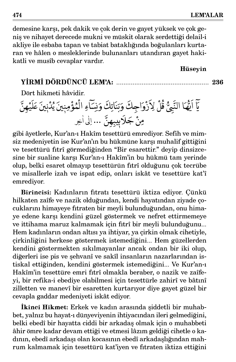 gibi âyetlerle, Kur’an-ı Hakîm tesettürü emrediyor. Sefih ve mimsiz medeniyetin ise Kur’an’ın bu hükmüne karşı muhalif gittiğini ve tesettürü fıtrî görmediğinden “Bir esarettir.” deyip dinsizcesine bir sualine karşı Kur’an-ı Hakîm’in bu hükmü tam yerinde olup, belki esaret olmayıp tesettürün fıtrî olduğunu çok tecrübe ve misallerle izah ve ispat edip, onları iskât ve tesettüre kat’î emrediyor.
