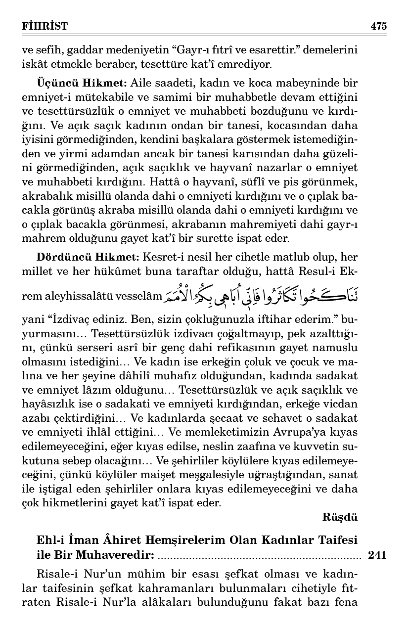 Birincisi: Kadınların fıtratı tesettürü iktiza ediyor. Çünkü hilkaten zaîfe ve nazik olduğundan, kendi hayatından ziyade çocuklarını himayeye fıtraten bir meyli bulunduğundan, onu himaye edene karşı kendini güzel göstermek ve nefret ettirmemeye ve ittihama maruz kalmamak için fıtrî bir meyli bulunduğunu... Hem kadınların ondan altısı ya ihtiyar, ya çirkin olmak cihetiyle, çirkinliğini herkese göstermek istemediğini... Hem güzellerden kendini göstermekten sıkılmayanlar ancak ondan bir iki olup, diğerleri ise pis ve şehvanî ve sakîl insanların nazarlarından istiskal ettiğinden, kendini göstermek istemediğini... Ve Kur’an-ı Hakîm’in tesettüre emri fıtrî olmakla beraber, o nazik ve zaîfeyi, bir refika-i ebediye olabilmesi için tesettürle zahirî ve bâtınî zilletten ve manevî bir esaretten kurtarıyor diye gayet güzel bir cevapla gaddar medeniyeti iskât ediyor.