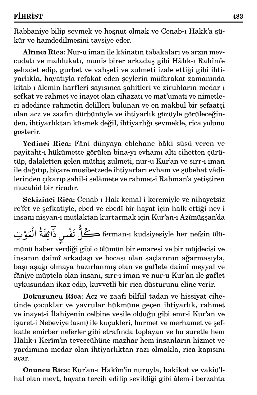 Birinci Rica: Her şeyin aslı, nuru, ziyası, menbaı, madeni, çeşmesi iman olduğunu; her şeyden evvel, o kudsî, münezzeh, muallâ nuru kazanmaya çalışmak lâzım geldiğini beyan eden kıymetli, îcazlı bir ricadır.