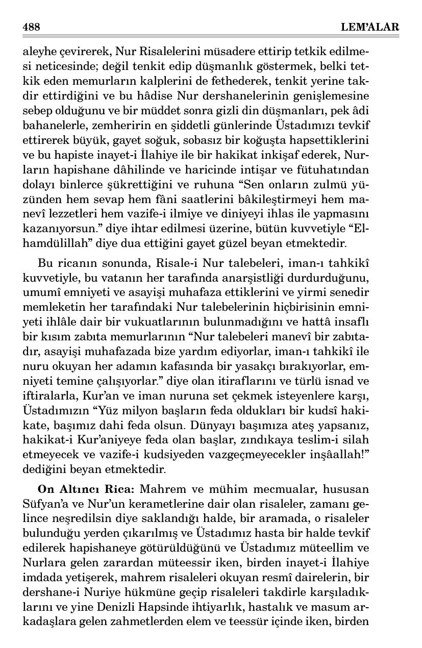 On Altıncı Rica: Mahrem ve mühim mecmualar, hususan Süfyan’a ve Nur’un kerametlerine dair olan risaleler, zamanı gelince neşredilsin diye saklandığı halde, bir aramada, o risaleler bulunduğu yerden çıkarılmış ve Üstadımız hasta bir halde tevkif edilerek hapishaneye götürüldüğünü ve Üstadımız müteellim ve Nurlara gelen zarardan müteessir iken, birden inayet-i İlahiye imdada yetişerek, mahrem risaleleri okuyan resmî dairelerin, bir dershane-i Nuriye hükmüne geçip risaleleri takdirle karşıladıklarını ve yine Denizli Hapsinde ihtiyarlık, hastalık ve masum arkadaşlara gelen zahmetlerden elem ve teessür içinde iken, birden