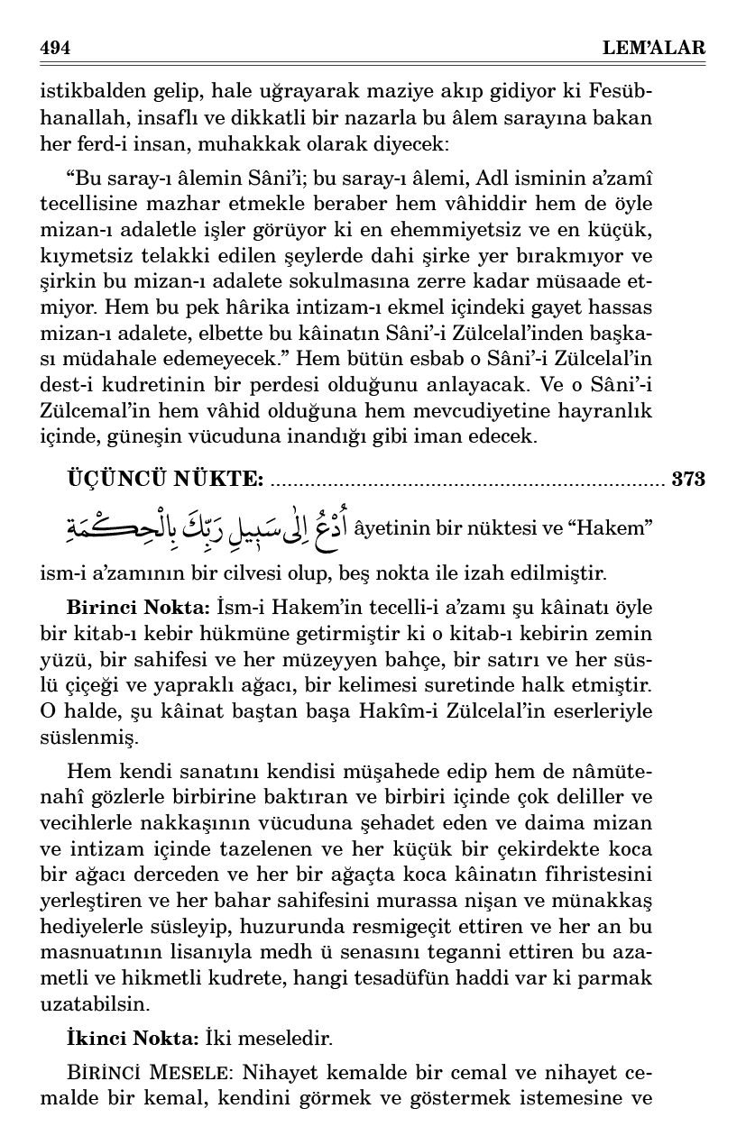 Birinci Nokta: İsm-i Hakem’in tecelli-i a’zamı şu kâinatı öyle bir kitab-ı kebir hükmüne getirmiştir ki o kitab-ı kebirin zemin yüzü, bir sahifesi ve her müzeyyen bahçe, bir satırı ve her süslü çiçeği ve yapraklı ağacı, bir kelimesi suretinde halk etmiştir. O halde, şu kâinat baştan başa Hakîm-i Zülcelal’in eserleriyle süslenmiş.