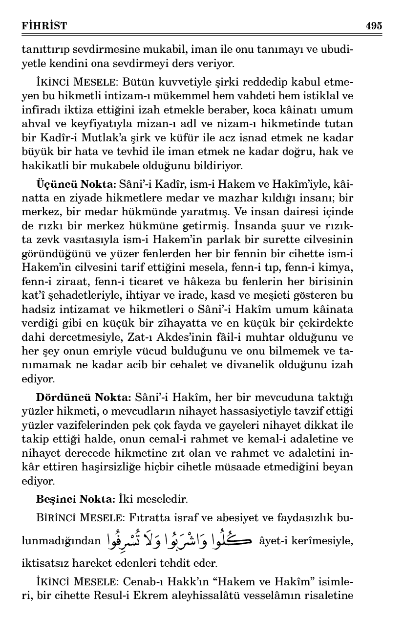 “Bu saray-ı âlemin Sâni’i; bu saray-ı âlemi, Adl isminin a’zamî tecellisine mazhar etmekle beraber hem vâhiddir hem de öyle mizan-ı adaletle işler görüyor ki en ehemmiyetsiz ve en küçük, kıymetsiz telakki edilen şeylerde dahi şirke yer bırakmıyor ve şirkin bu mizan-ı adalete sokulmasına zerre kadar müsaade etmiyor. Hem bu pek hârika intizam-ı ekmel içindeki gayet hassas mizan-ı adalete, elbette bu kâinatın Sâni’-i Zülcelal’inden başkası müdahale edemeyecek.” Hem bütün esbab o Sâni’-i Zülcelal’in dest-i kudretinin bir perdesi olduğunu anlayacak. Ve o Sâni’-i Zülcemal’in hem vâhid olduğuna hem mevcudiyetine hayranlık içinde, güneşin vücuduna inandığı gibi iman edecek.