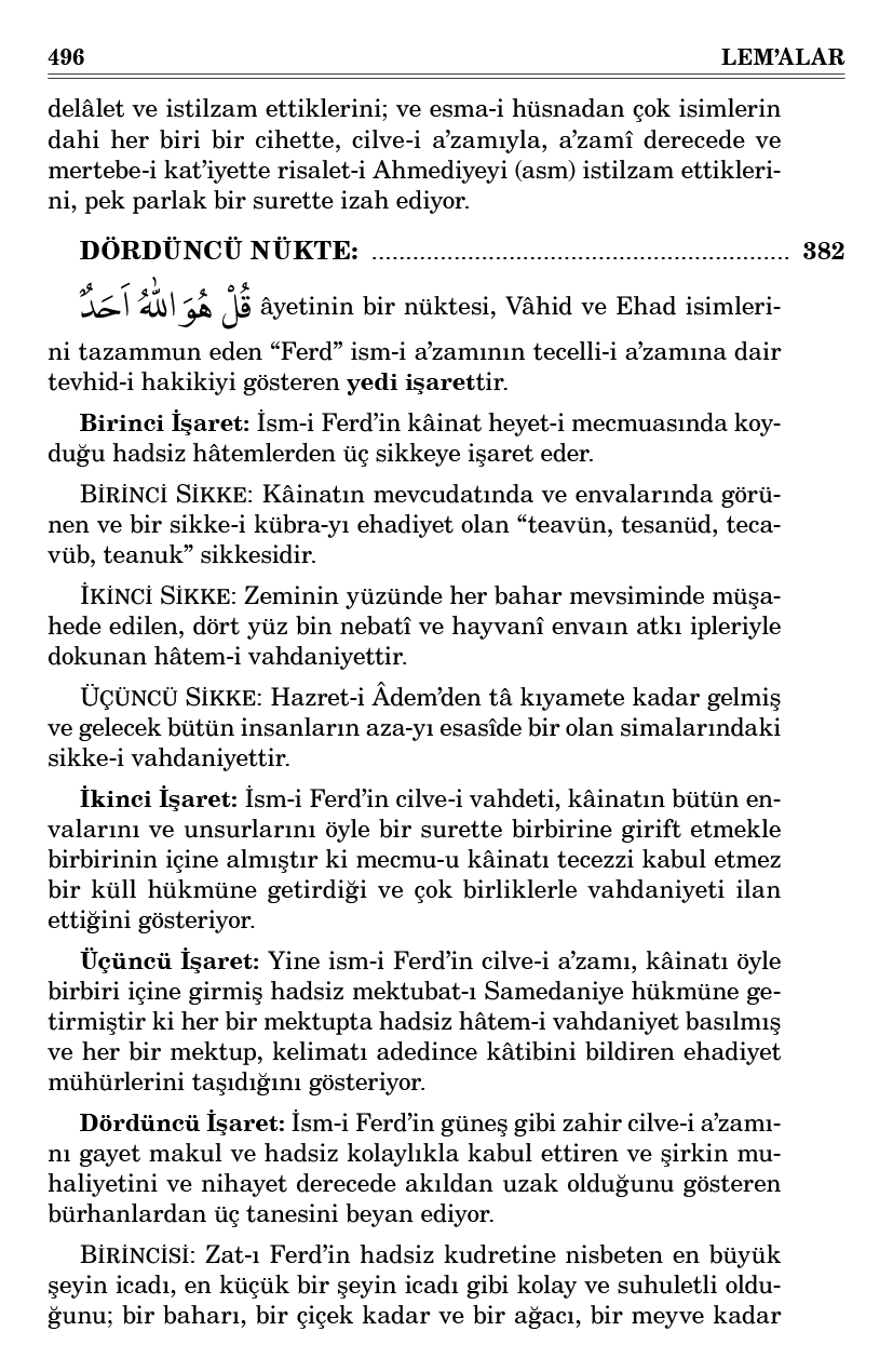 Dördüncü İşaret: İsm-i Ferd’in güneş gibi zahir cilve-i a’zamını gayet makul ve hadsiz kolaylıkla kabul ettiren ve şirkin muhaliyetini ve nihayet derecede akıldan uzak olduğunu gösteren bürhanlardan üç tanesini beyan ediyor.