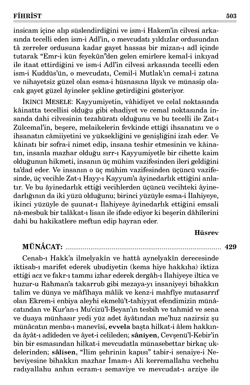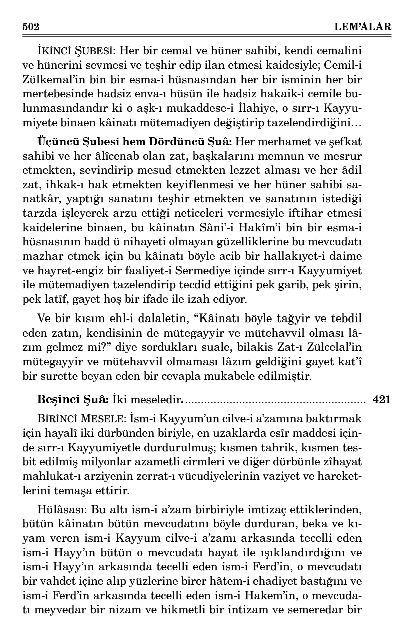 İkinci Şubesi: Her bir cemal ve hüner sahibi, kendi cemalini ve hünerini sevmesi ve teşhir edip ilan etmesi kaidesiyle; Cemil-i Zülkemal’in bin bir esma-i hüsnasından her bir isminin her bir mertebesinde hadsiz enva-ı hüsün ile hadsiz hakaik-i cemile bulunmasındandır ki o aşk-ı mukaddese-i İlahiye, o sırr-ı Kayyumiyete binaen kâinatı mütemadiyen değiştirip tazelendirdiğini…
