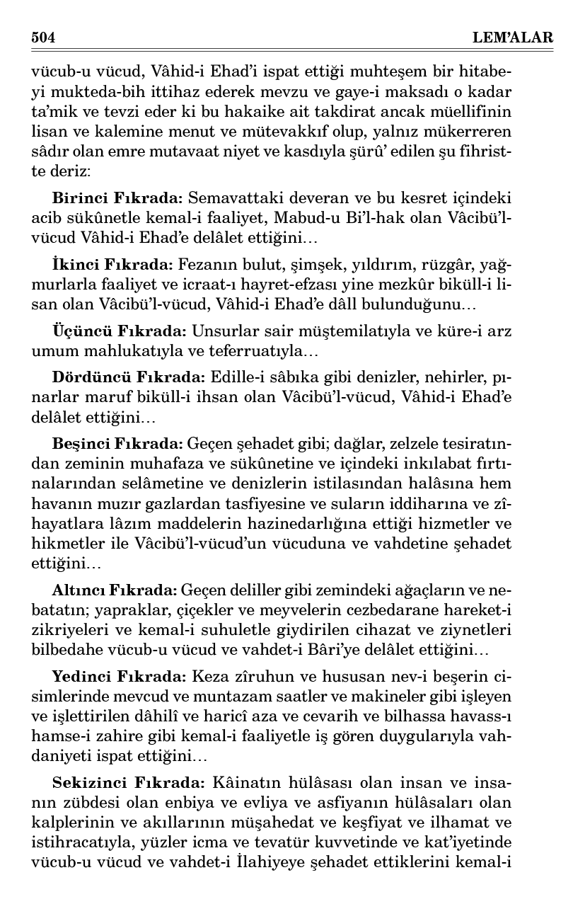 Yedinci Fıkrada: Keza zîruhun ve hususan nev-i beşerin cisimlerinde mevcud ve muntazam saatler ve makineler gibi işleyen ve işlettirilen dâhilî ve haricî aza ve cevarih ve bilhassa havass-ı hamse-i zahire gibi kemal-i faaliyetle iş gören duygularıyla vahdaniyeti ispat ettiğini…