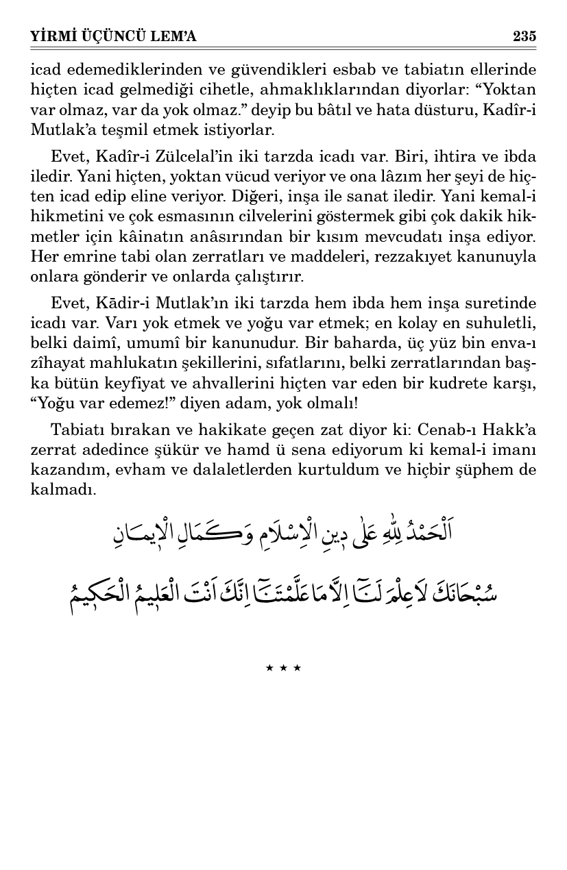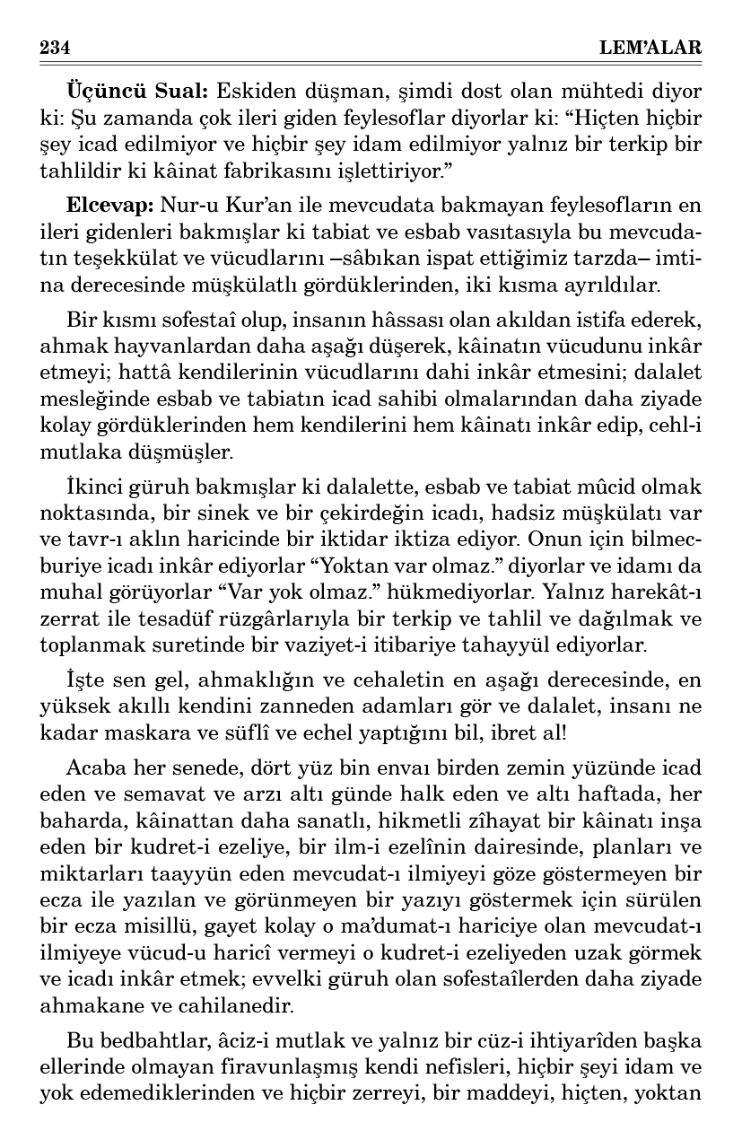Acaba her senede, dört yüz bin envaı birden zemin yüzünde icad eden ve semavat ve arzı altı günde halk eden ve altı haftada, her baharda, kâinattan daha sanatlı, hikmetli zîhayat bir kâinatı inşa eden bir kudret-i ezeliye, bir ilm-i ezelînin dairesinde, planları ve miktarları taayyün eden mevcudat-ı ilmiyeyi göze göstermeyen bir ecza ile yazılan ve görünmeyen bir yazıyı göstermek için sürülen bir ecza misillü, gayet kolay o ma’dumat-ı hariciye olan mevcudat-ı ilmiyeye vücud-u haricî vermeyi o kudret-i ezeliyeden uzak görmek ve icadı inkâr etmek; evvelki güruh olan sofestaîlerden daha ziyade ahmakane ve cahilanedir.