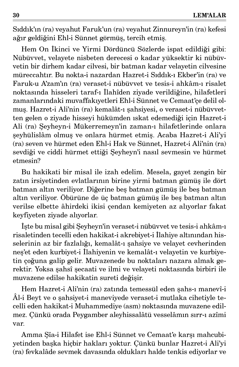 İşte ehl-i hakkın mezhebi hiçbir cihetle Hazret-i Ali’yi (ra) tenkis etmez, sû-i ahlâk ile ittiham etmez. Öyle bir hârika-i şecaate korkaklık isnad etmez ve derler ki: “Hazret-i Ali (ra) Hulefa-i Raşidîn’i hak görmeseydi bir dakika tanımaz ve itaat etmezdi. Demek ki onları haklı ve racih gördüğü için gayret ve şecaatini hakperestlik yoluna teslim etmiş.”
