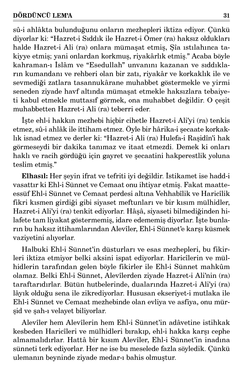 Halbuki Ehl-i Sünnet’in düsturları ve esas mezhepleri, bu fikirleri iktiza etmiyor belki aksini ispat ediyorlar. Haricîlerin ve mülhidlerin tarafından gelen böyle fikirler ile Ehl-i Sünnet mahkûm olamaz. Belki Ehl-i Sünnet, Alevîlerden ziyade Hazret-i Ali’nin (ra) taraftarıdırlar. Bütün hutbelerinde, dualarında Hazret-i Ali’yi (ra) lâyık olduğu sena ile zikrediyorlar. Hususan ekseriyet-i mutlaka ile Ehl-i Sünnet ve Cemaat mezhebinde olan evliya ve asfiya, onu mürşid ve şah-ı velayet biliyorlar.
