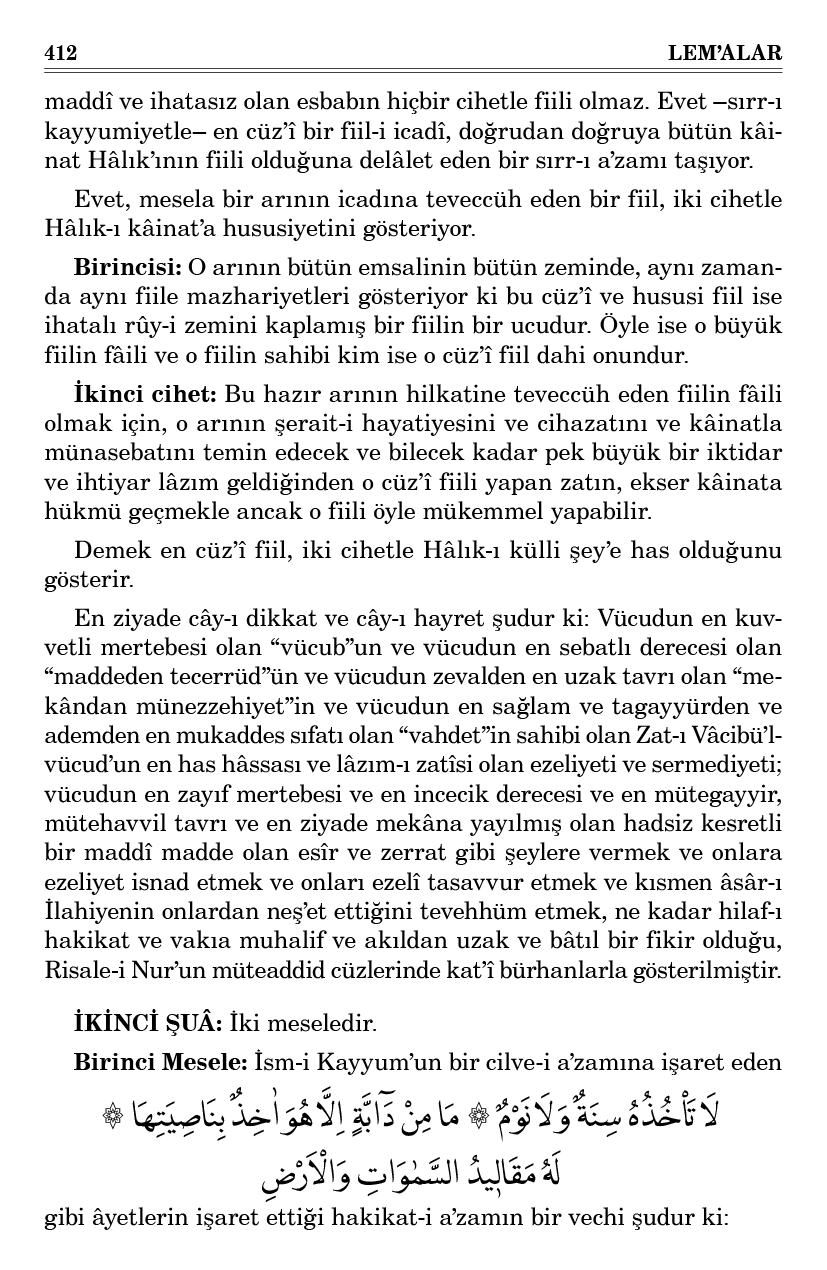 Evet, bir zîhayatın cesedindeki zerrelerin her bir azaya mahsus bir heyet ile küme küme toplanıp dağılmadıkları ve sel gibi akan unsurların fırtınaları içinde vaziyetlerini muhafaza edip dağılmamaları ve muntazaman durmaları, bilbedahe kendi kendilerinden olmayıp belki sırr-ı kayyumiyetle olduğundan; her bir ceset muntazam bir tabur, her bir nevi muntazam bir ordu hükmünde olarak bütün zîhayat ve mürekkebatın zemin yüzünde ve yıldızların feza âleminde durmaları ve gezmeleri gibi, bu zerreler dahi hadsiz dilleriyle sırr-ı kayyumiyeti ilan ederler.
