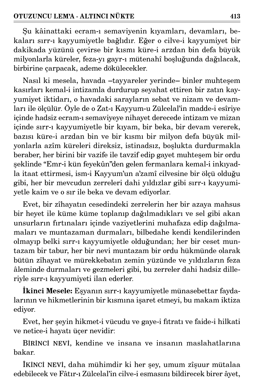 Nasıl ki mesela, havada –tayyareler yerinde– binler muhteşem kasırları kemal-i intizamla durdurup seyahat ettiren bir zatın kayyumiyet iktidarı, o havadaki sarayların sebat ve nizam ve devamları ile ölçülür. Öyle de o Zat-ı Kayyum-u Zülcelal’in madde-i esîriye içinde hadsiz ecram-ı semaviyeye nihayet derecede intizam ve mizan içinde sırr-ı kayyumiyetle bir kıyam, bir beka, bir devam vererek, bazısı küre-i arzdan bin ve bir kısmı bir milyon defa büyük milyonlarla azîm küreleri direksiz, istinadsız, boşlukta durdurmakla beraber, her birini bir vazife ile tavzif edip gayet muhteşem bir ordu şeklinde “Emr-i kün feyekûn”den gelen fermanlara kemal-i inkıyadla itaat ettirmesi, ism-i Kayyum’un a’zamî cilvesine bir ölçü olduğu gibi, her bir mevcudun zerreleri dahi yıldızlar gibi sırr-ı kayyumiyetle kaim ve o sır ile beka ve devam ediyorlar.