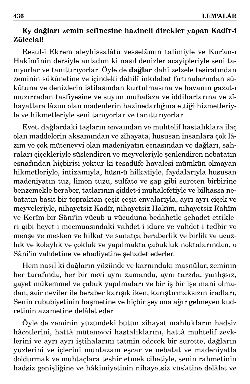 Resul-i Ekrem aleyhissalâtü vesselâmın talimiyle ve Kur’an-ı Hakîm’inin dersiyle anladım ki nasıl denizler acayipleriyle seni tanıyorlar ve tanıttırıyorlar. Öyle de dağlar dahi zelzele tesiratından zeminin sükûnetine ve içindeki dâhilî inkılabat fırtınalarından sükûtuna ve denizlerin istilasından kurtulmasına ve havanın gazat-ı muzırradan tasfiyesine ve suyun muhafaza ve iddiharlarına ve zîhayatlara lâzım olan madenlerin hazinedarlığına ettiği hizmetleriyle ve hikmetleriyle seni tanıyorlar ve tanıttırıyorlar.