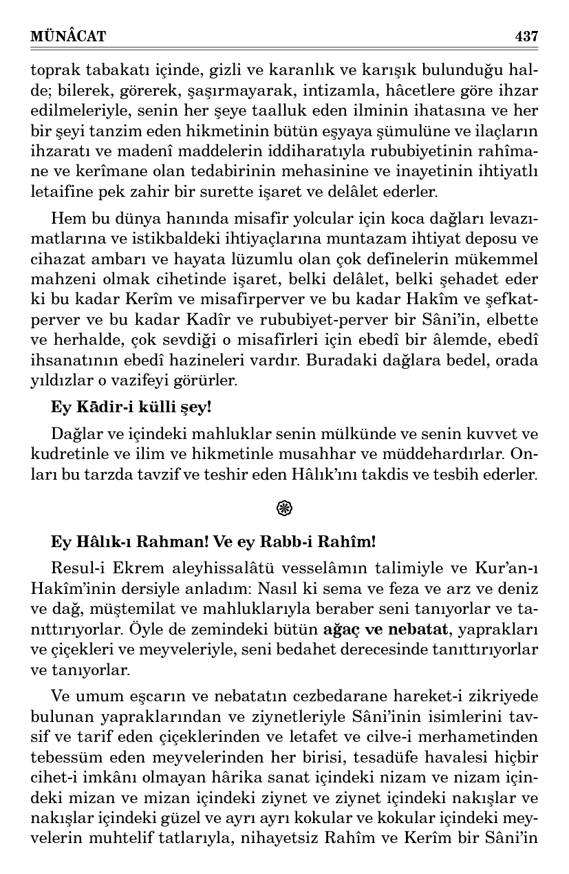 Öyle de zeminin yüzündeki bütün zîhayat mahlukların hadsiz hâcetlerini, hattâ mütenevvi hastalıklarını, hattâ muhtelif zevklerini ve ayrı ayrı iştihalarını tatmin edecek bir surette, dağların yüzlerini ve içlerini muntazam eşcar ve nebatat ve madeniyatla doldurmak ve muhtaçlara teshir etmek cihetiyle, senin rahmetinin hadsiz genişliğine ve hâkimiyetinin nihayetsiz vüs’atine delâlet ve