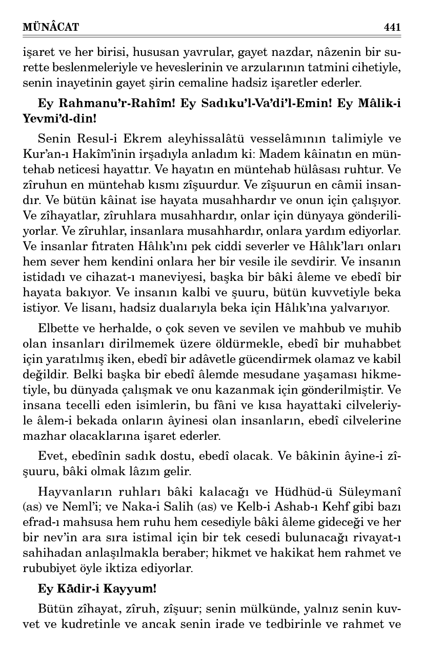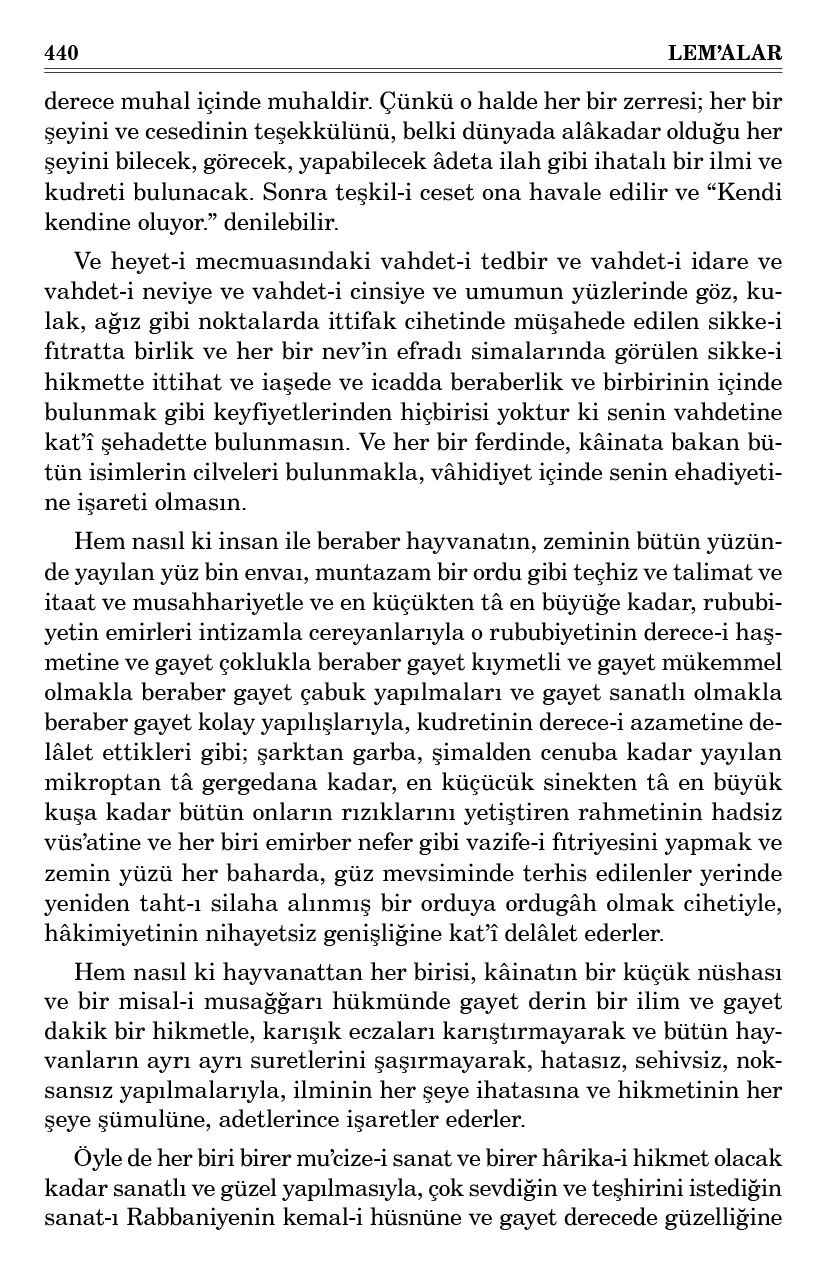 Ve heyet-i mecmuasındaki vahdet-i tedbir ve vahdet-i idare ve vahdet-i neviye ve vahdet-i cinsiye ve umumun yüzlerinde göz, kulak, ağız gibi noktalarda ittifak cihetinde müşahede edilen sikke-i fıtratta birlik ve her bir nev’in efradı simalarında görülen sikke-i hikmette ittihat ve iaşede ve icadda beraberlik ve birbirinin içinde bulunmak gibi keyfiyetlerinden hiçbirisi yoktur ki senin vahdetine kat’î şehadette bulunmasın. Ve her bir ferdinde, kâinata bakan bütün isimlerin cilveleri bulunmakla, vâhidiyet içinde senin ehadiyetine işareti olmasın.