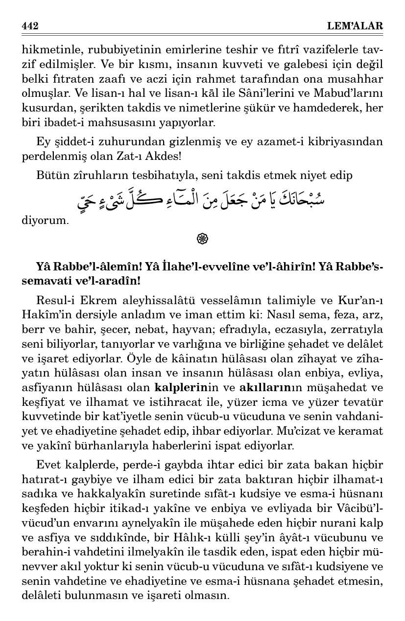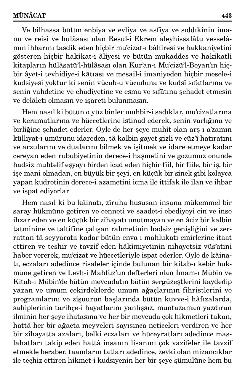 Evet kalplerde, perde-i gaybda ihtar edici bir zata bakan hiçbir hatırat-ı gaybiye ve ilham edici bir zata baktıran hiçbir ilhamat-ı sadıka ve hakkalyakîn suretinde sıfât-ı kudsiye ve esma-i hüsnanı keşfeden hiçbir itikad-ı yakîne ve enbiya ve evliyada bir Vâcibü’l-vücud’un envarını aynelyakîn ile müşahede eden hiçbir nurani kalp ve asfiya ve sıddıkînde, bir Hâlık-ı külli şey’in âyât-ı vücubunu ve berahin-i vahdetini ilmelyakîn ile tasdik eden, ispat eden hiçbir münevver akıl yoktur ki senin vücub-u vücuduna ve sıfât-ı kudsiyene ve senin vahdetine ve ehadiyetine ve esma-i hüsnana şehadet etmesin, delâleti bulunmasın ve işareti olmasın.