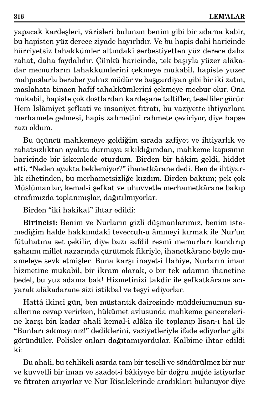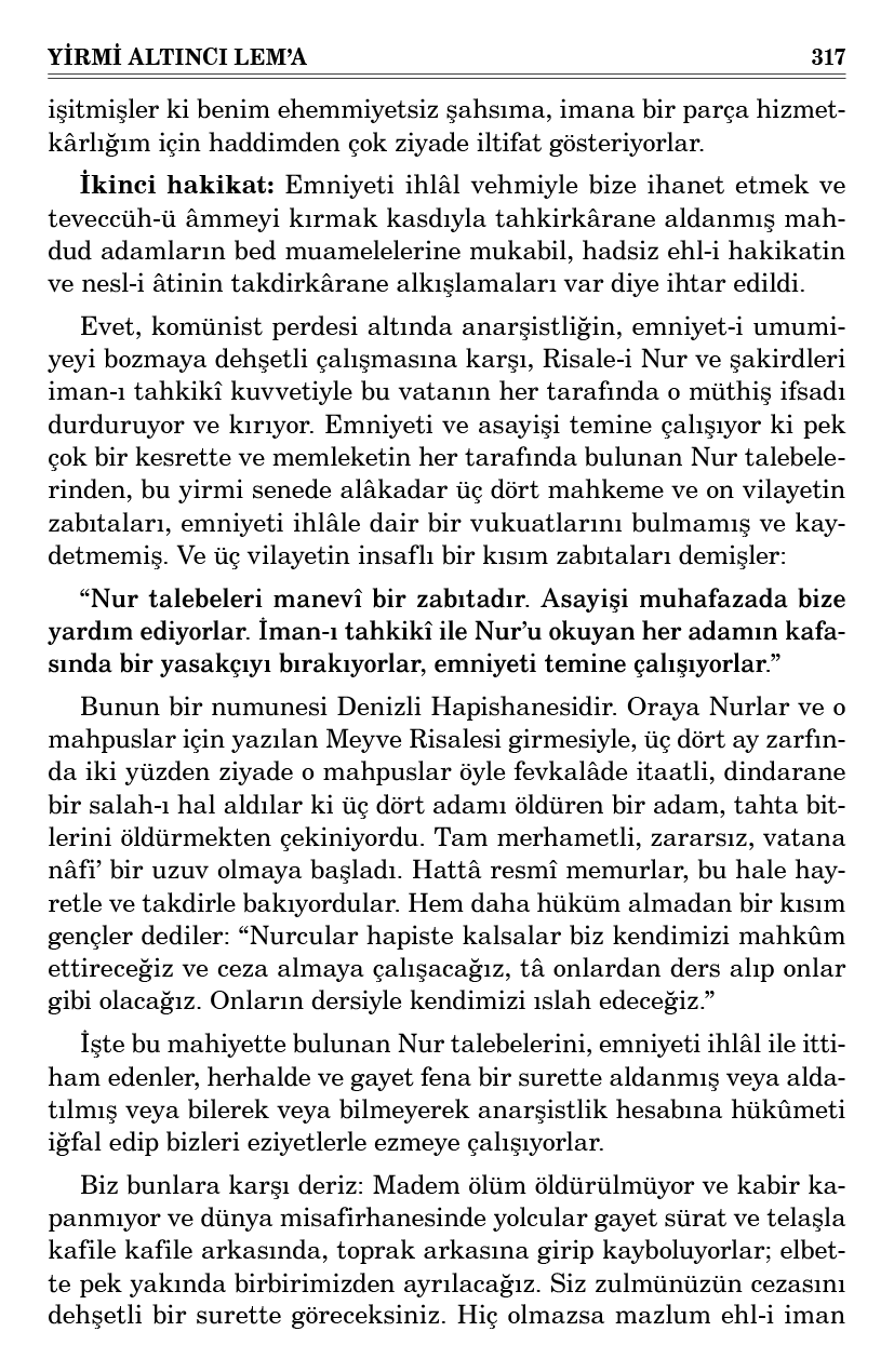 İşte bu mahiyette bulunan Nur talebelerini, emniyeti ihlâl ile ittiham edenler, herhalde ve gayet fena bir surette aldanmış veya aldatılmış veya bilerek veya bilmeyerek anarşistlik hesabına hükûmeti iğfal edip bizleri eziyetlerle ezmeye çalışıyorlar.
