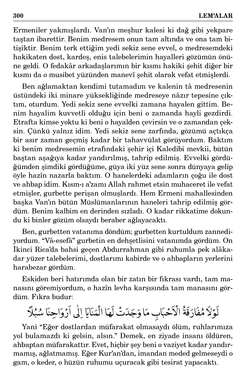 Ermeniler yakmışlardı. Van’ın meşhur kalesi ki dağ gibi yekpare taştan ibarettir. Benim medresem onun tam altında ve ona tam bitişiktir. Benim terk ettiğim yedi sekiz sene evvel, o medresemdeki hakikaten dost, kardeş, enis talebelerimin hayalleri gözümün önüne geldi. O fedakâr arkadaşlarımın bir kısmı hakiki şehit diğer bir kısmı da o musibet yüzünden manevî şehit olarak vefat etmişlerdi.
