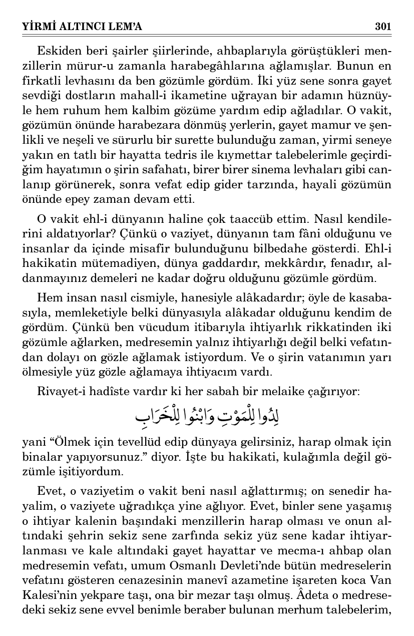 Ben, gurbetten vatanıma döndüm; gurbetten kurtuldum zannediyordum. “Vâ-esefâ” gurbetin en dehşetlisini vatanımda gördüm. On İkinci Rica’da bahsi geçen Abdurrahman gibi ruhumla pek alâkadar yüzer talebelerimi, dostlarımı kabirde ve o ahbapların yerlerini harabezar gördüm. Eskiden beri hatırımda olan bir zatın bir fıkrası vardı, tam manasını göremiyordum, o hazîn levha karşısında tam manasını gördüm. Fıkra budur: