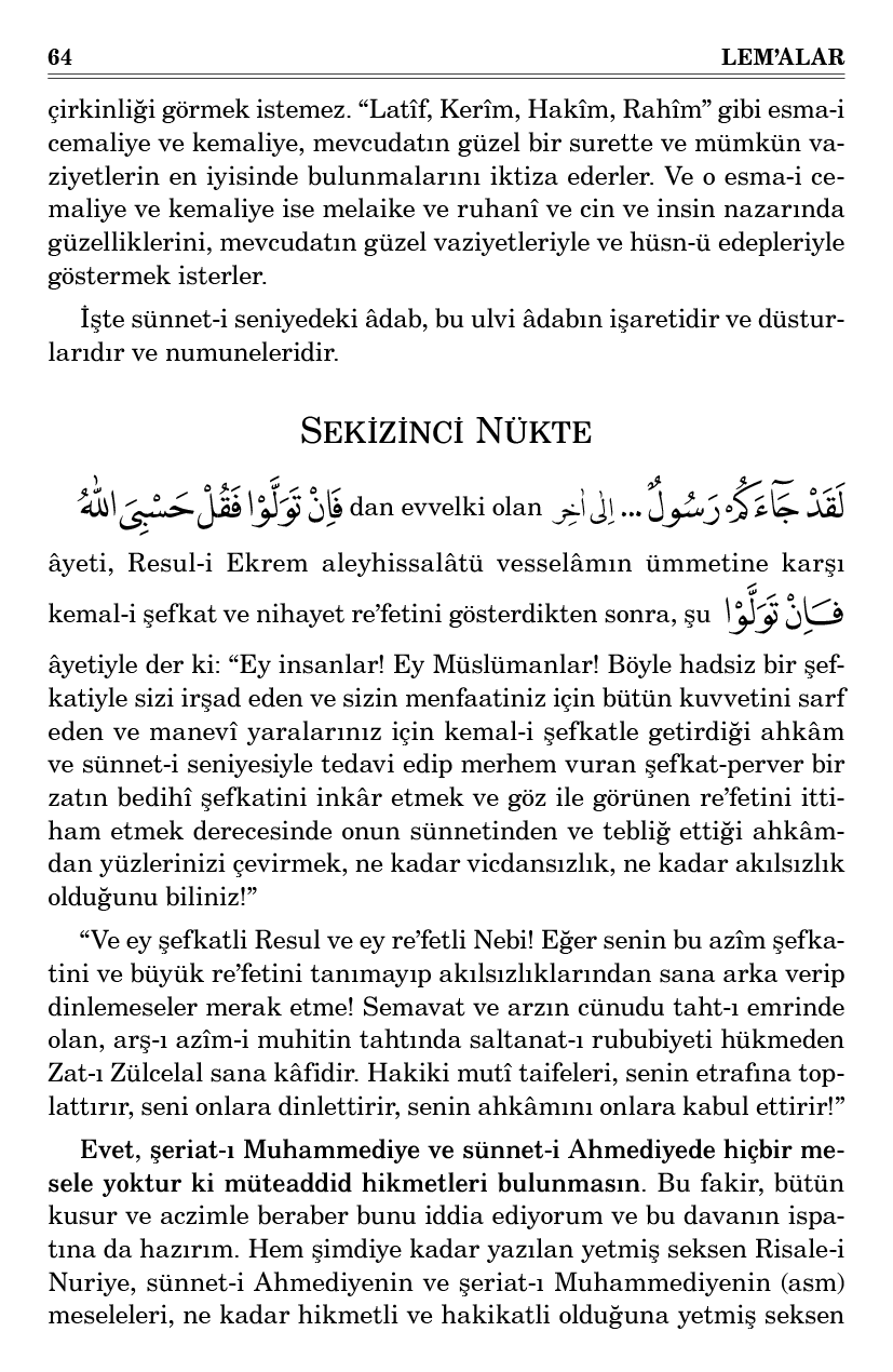 “Ve ey şefkatli Resul ve ey re’fetli Nebi! Eğer senin bu azîm şefkatini ve büyük re’fetini tanımayıp akılsızlıklarından sana arka verip dinlemeseler merak etme! Semavat ve arzın cünudu taht-ı emrinde olan, arş-ı azîm-i muhitin tahtında saltanat-ı rububiyeti hükmeden Zat-ı Zülcelal sana kâfidir. Hakiki mutî taifeleri, senin etrafına toplattırır, seni onlara dinlettirir, senin ahkâmını onlara kabul ettirir!”
