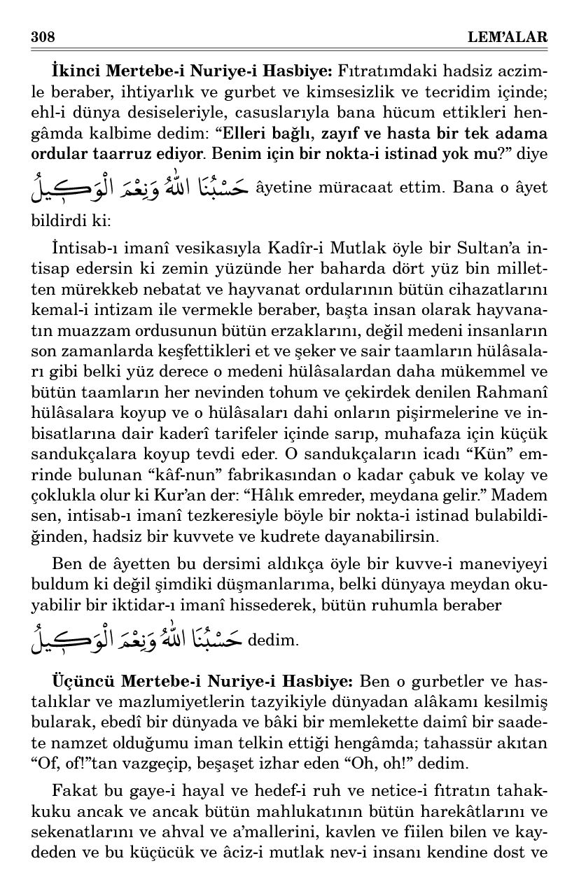 Ben de âyetten bu dersimi aldıkça öyle bir kuvve-i maneviyeyi buldum ki değil şimdiki düşmanlarıma, belki dünyaya meydan okuyabilir bir iktidar-ı imanî hissederek, bütün ruhumla beraber حَسْبُنَا اللّٰهُ وَنِعْمَ الْوَكٖيلُ dedim.