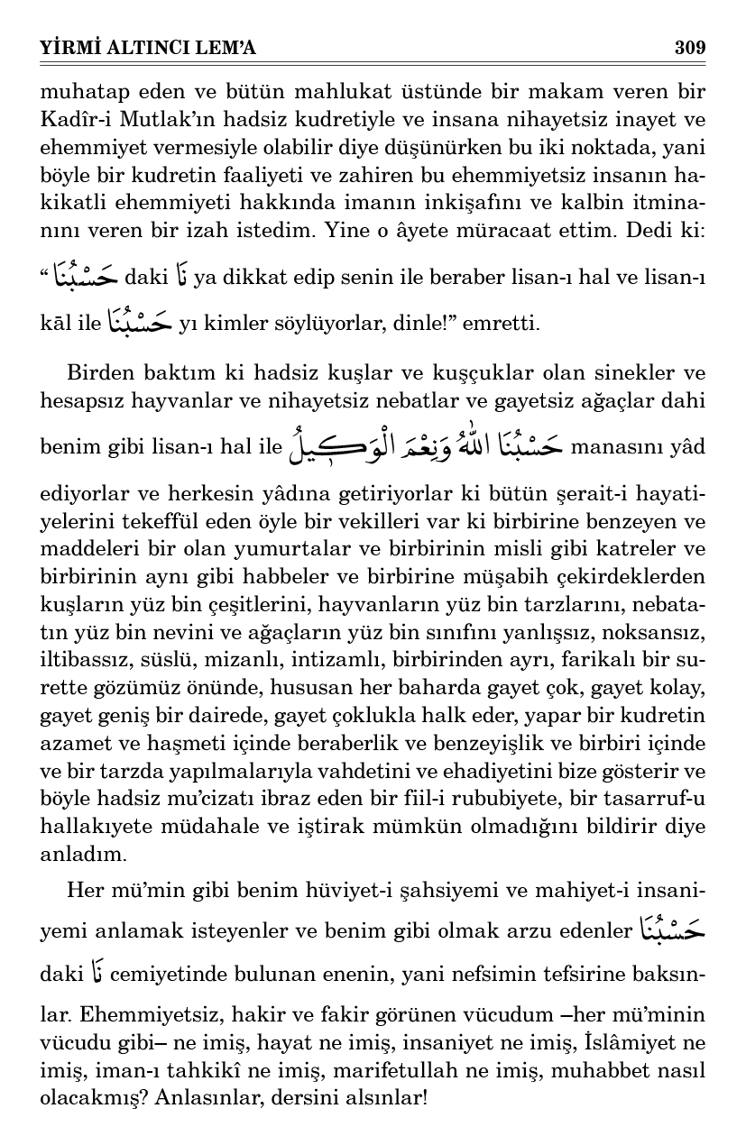 muhatap eden ve bütün mahlukat üstünde bir makam veren bir Kadîr-i Mutlak’ın hadsiz kudretiyle ve insana nihayetsiz inayet ve ehemmiyet vermesiyle olabilir diye düşünürken bu iki noktada, yani böyle bir kudretin faaliyeti ve zahiren bu ehemmiyetsiz insanın hakikatli ehemmiyeti hakkında imanın inkişafını ve kalbin itminanını veren bir izah istedim. Yine o âyete müracaat ettim. Dedi ki: “ حَسْبُنَا daki نَا ya dikkat edip senin ile beraber lisan-ı hal ve lisan-ı kāl ile حَسْبُنَا yı kimler söylüyorlar, dinle!” emretti.