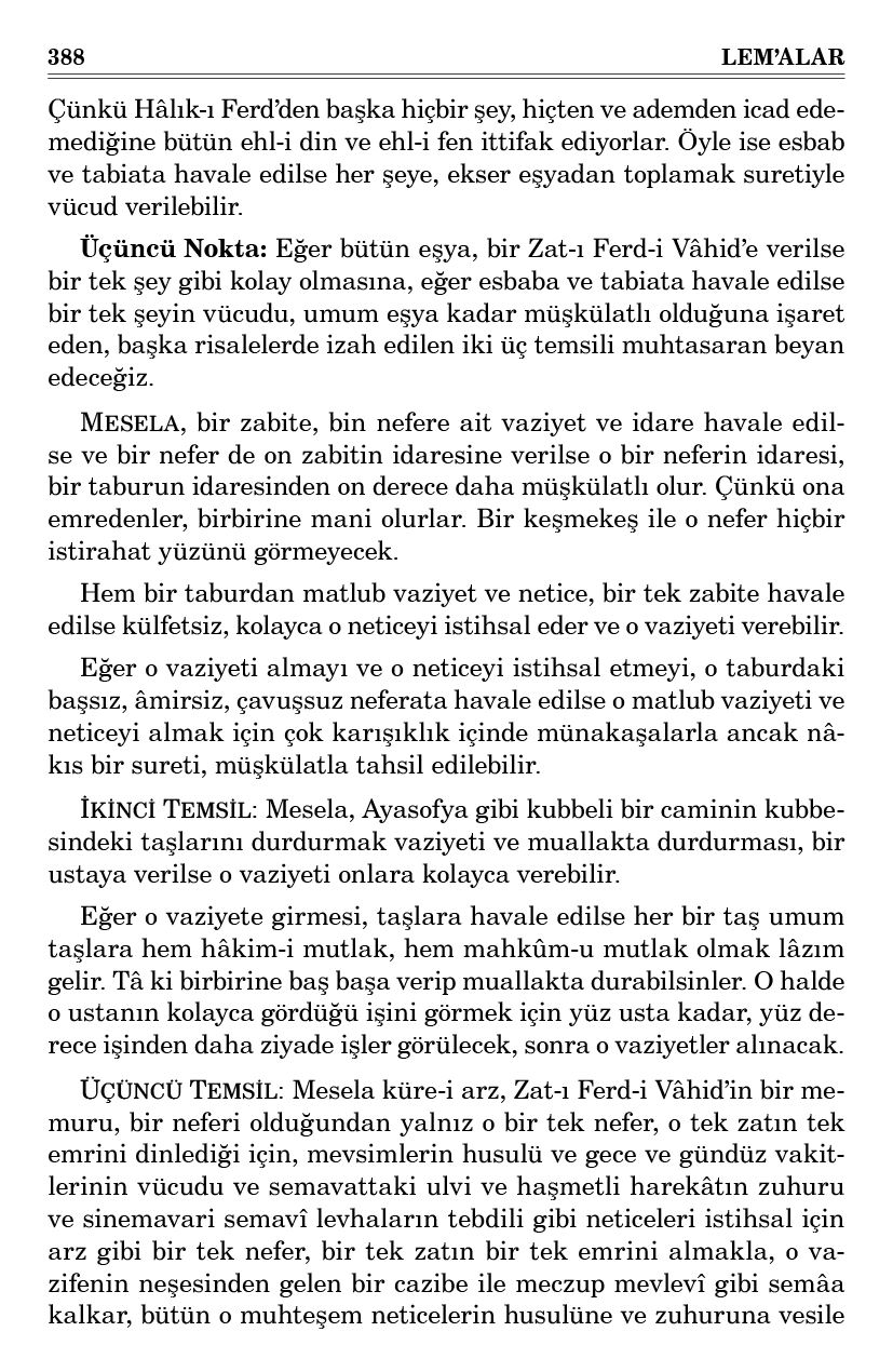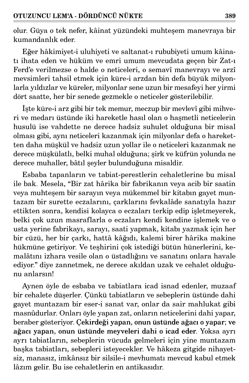 Eğer hâkimiyet-i uluhiyeti ve saltanat-ı rububiyeti umum kâinatı ihata eden ve hüküm ve emri umum mevcudata geçen bir Zat-ı Ferd’e verilmezse o halde o neticeleri, o semavî manevrayı ve arzî mevsimleri tahsil etmek için küre-i arzdan bin defa büyük milyonlarla yıldızlar ve küreler, milyonlar sene uzun bir mesafeyi her yirmi dört saatte, her bir senede gezmekle o neticeler gösterilebilir.