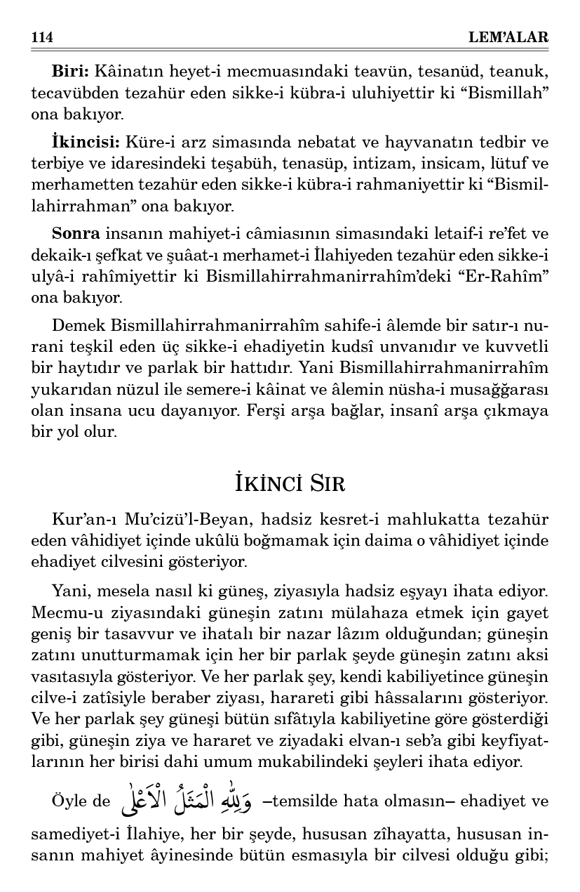 İşte vâhidiyet içinde ukûlü boğmamak ve kalpler Zat-ı Akdes’i unutmamak için daima vâhidiyetteki sikke-i ehadiyeti nazara veriyor ki o sikkenin üç mühim ukdesini irae eden Bismillahirrahmanirrahîm’dir.