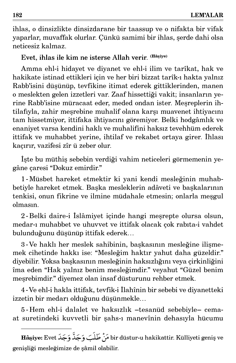 9 - Ve ehemmiyetsiz, rekabetkârane hissiyatını terk etmekle ihlası kazanır, vazifesini hakkıyla îfa eder. (Hâşiye)
