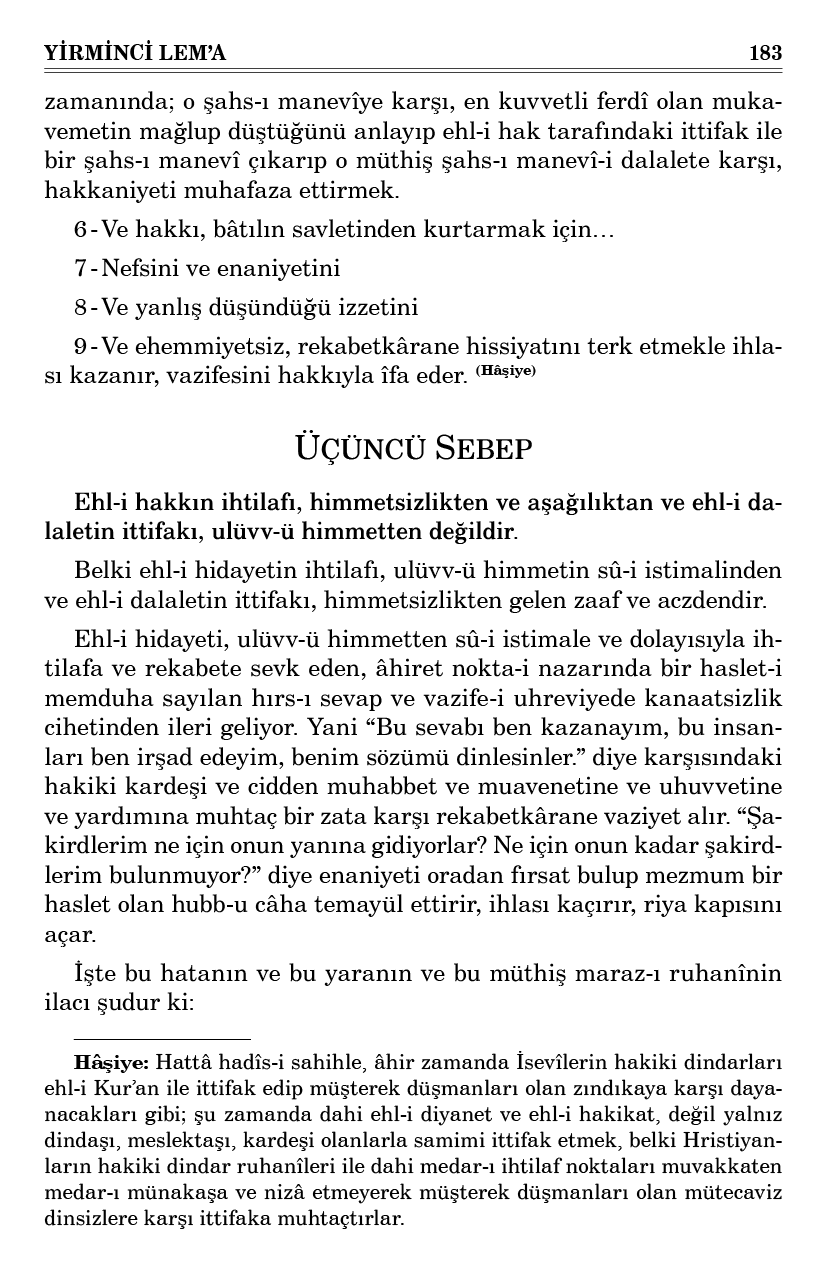 Hâşiye: Hattâ hadîs-i sahihle, âhir zamanda İsevîlerin hakiki dindarları ehl-i Kur’an ile ittifak edip müşterek düşmanları olan zındıkaya karşı dayanacakları gibi; şu zamanda dahi ehl-i diyanet ve ehl-i hakikat, değil yalnız dindaşı, meslektaşı, kardeşi olanlarla samimi ittifak etmek, belki Hristiyanların hakiki dindar ruhanîleri ile dahi medar-ı ihtilaf noktaları muvakkaten medar-ı münakaşa ve nizâ etmeyerek müşterek düşmanları olan mütecaviz dinsizlere karşı ittifaka muhtaçtırlar.
