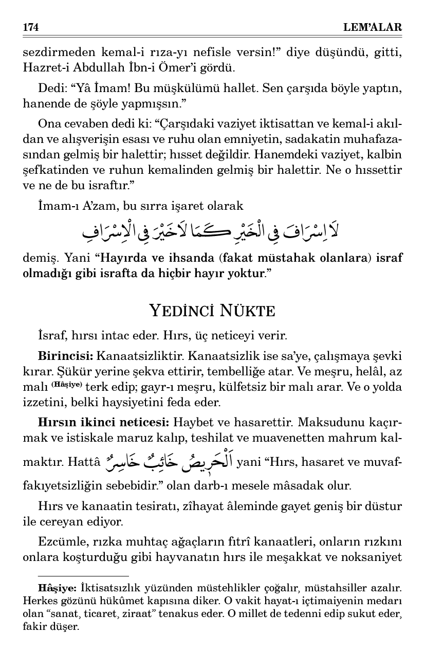 Ona cevaben dedi ki: “Çarşıdaki vaziyet iktisattan ve kemal-i akıldan ve alışverişin esası ve ruhu olan emniyetin, sadakatin muhafazasından gelmiş bir halettir; hısset değildir. Hanemdeki vaziyet, kalbin şefkatinden ve ruhun kemalinden gelmiş bir halettir. Ne o hıssettir ve ne de bu israftır.”