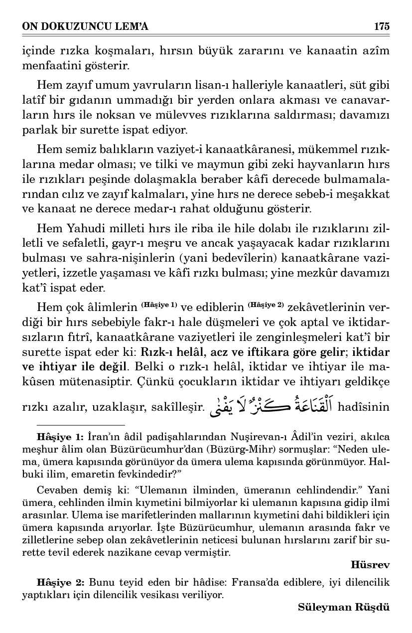 Birincisi: Kanaatsizliktir. Kanaatsizlik ise sa’ye, çalışmaya şevki kırar. Şükür yerine şekva ettirir, tembelliğe atar. Ve meşru, helâl, az malı (Hâşiye) terk edip; gayr-ı meşru, külfetsiz bir malı arar. Ve o yolda izzetini, belki haysiyetini feda eder.