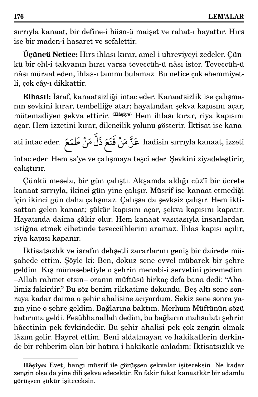Elhasıl: İsraf, kanaatsizliği intac eder. Kanaatsizlik ise çalışmanın şevkini kırar, tembelliğe atar; hayatından şekva kapısını açar, mütemadiyen şekva ettirir. (Hâşiye) Hem ihlası kırar, riya kapısını açar. Hem izzetini kırar, dilencilik yolunu gösterir. İktisat ise kanaati intac eder. عَزَّ مَنْ قَنَعَ ذَلَّ مَنْ طَمَعَ hadîsin sırrıyla kanaat, izzeti intac eder. Hem sa’ye ve çalışmaya teşci eder. Şevkini ziyadeleştirir, çalıştırır.