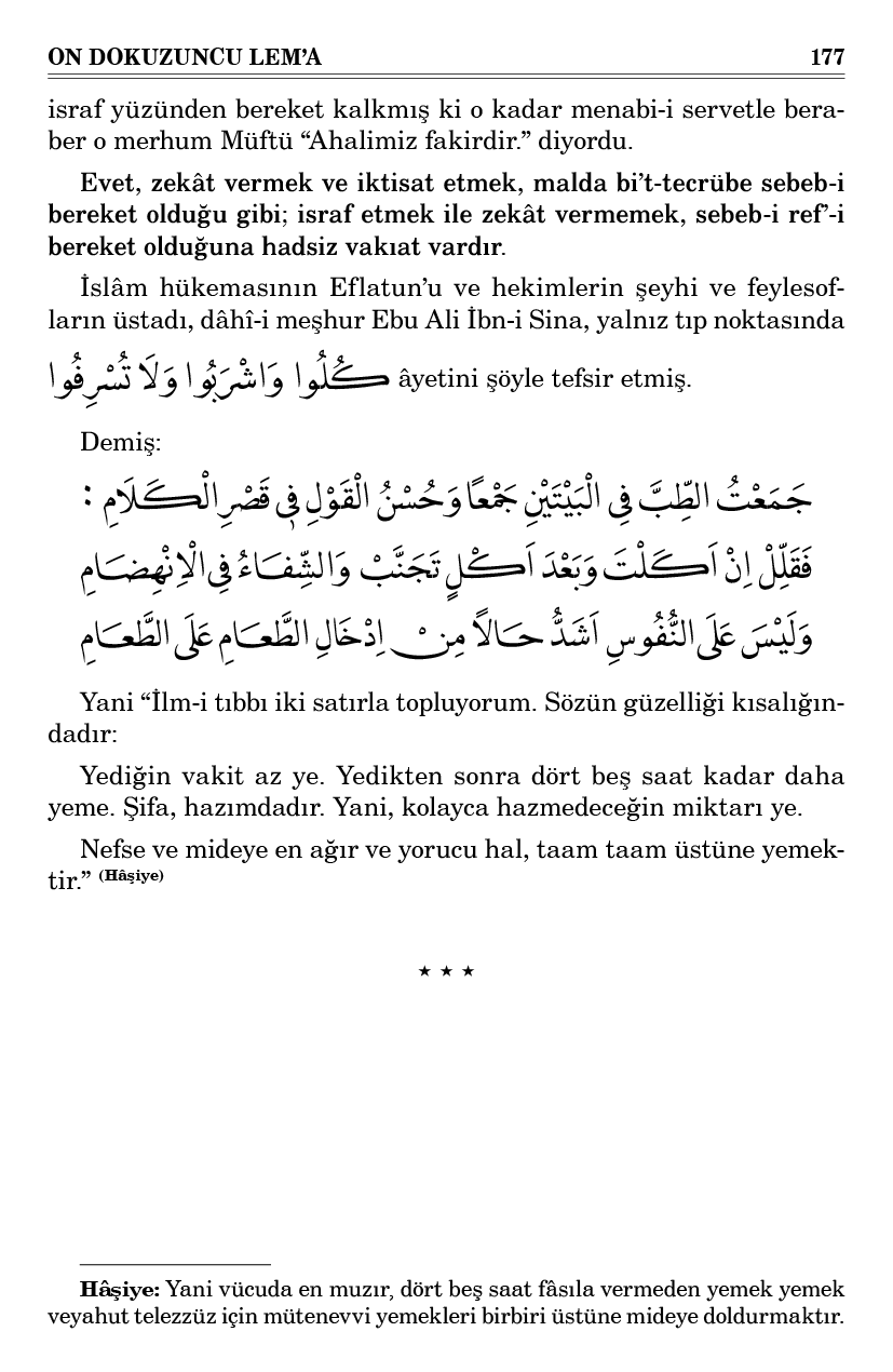 İktisatsızlık ve israfın dehşetli zararlarını geniş bir dairede müşahede ettim. Şöyle ki: Ben, dokuz sene evvel mübarek bir şehre geldim. Kış münasebetiyle o şehrin menabi-i servetini göremedim. –Allah rahmet etsin– oranın müftüsü birkaç defa bana dedi: “Ahalimiz fakirdir.” Bu söz benim rikkatime dokundu. Beş altı sene sonraya kadar daima o şehir ahalisine acıyordum. Sekiz sene sonra yazın yine o şehre geldim. Bağlarına baktım. Merhum Müftünün sözü hatırıma geldi. Fesübhanallah dedim, bu bağların mahsulatı şehrin hâcetinin pek fevkindedir. Bu şehir ahalisi pek çok zengin olmak lâzım gelir. Hayret ettim. Beni aldatmayan ve hakikatlerin derkinde bir rehberim olan bir hatıra-i hakikatle anladım: İktisatsızlık ve