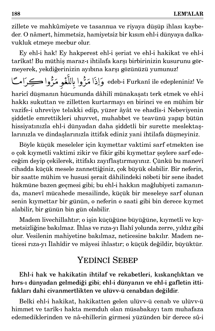 Ehl-i gaflet ve ehl-i dalalet ise meftun oldukları menfaatlerini kaçırmamak ve menfaat için perestiş ettikleri reislerini ve arkadaşlarını küstürmemek için zilletlerinden ve nâmertliklerinden, hamiyetsizliklerinden; mutlak arkadaşlarıyla, hattâ denî ve hain ve muzır olsalar dahi hâlisane ittihat hem menfaat etrafında toplanan ne şekilde olursa olsun şerikleriyle samimane ittifak ederler. Samimiyet neticesi olarak istifade ederler.