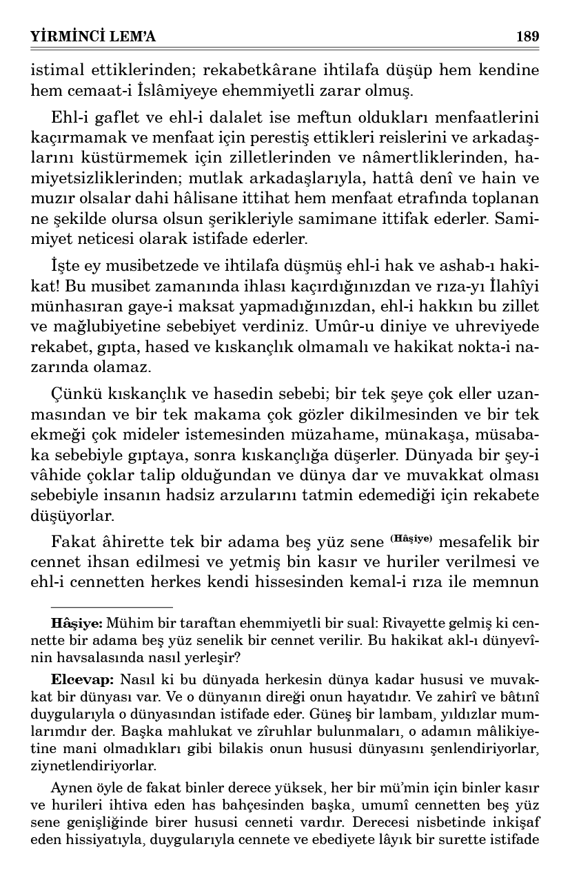 Fakat âhirette tek bir adama beş yüz sene (Hâşiye) mesafelik bir cennet ihsan edilmesi ve yetmiş bin kasır ve huriler verilmesi ve ehl-i cennetten herkes kendi hissesinden kemal-i rıza ile memnun
