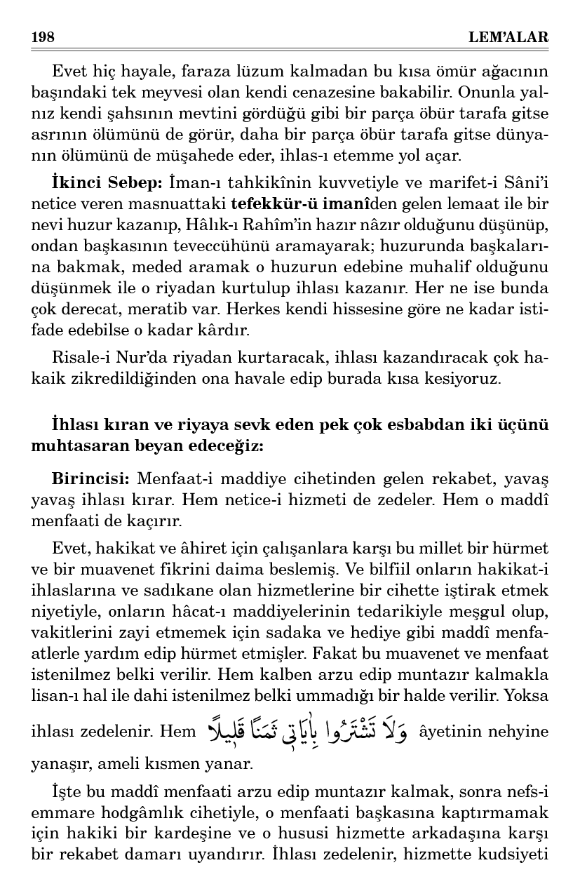 Aynen öyle de emval-i uhreviyede sırr-ı ihlas ile iştirak ve sırr-ı uhuvvet ile tesanüd ve sırr-ı ittihat ile teşrikü’l-mesai, o iştirak-i a’malden hasıl olan umum yekûn ve umum nur her birinin defter-i a’maline bitamamiha gireceği ehl-i hakikat mabeyninde meşhud ve vakidir ve vüs’at-i rahmet ve kerem-i İlahînin muktezasıdır.